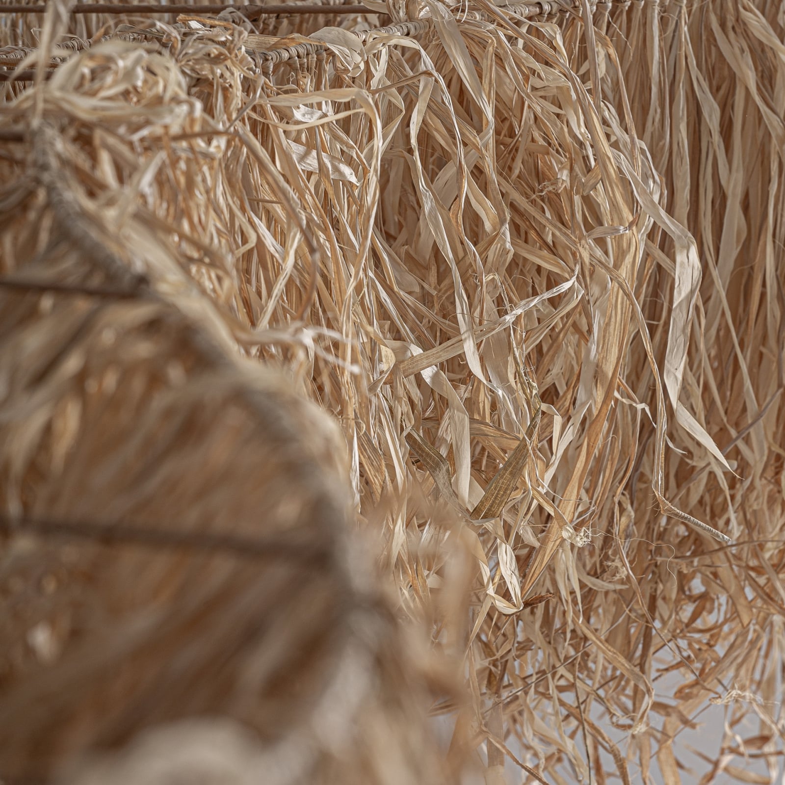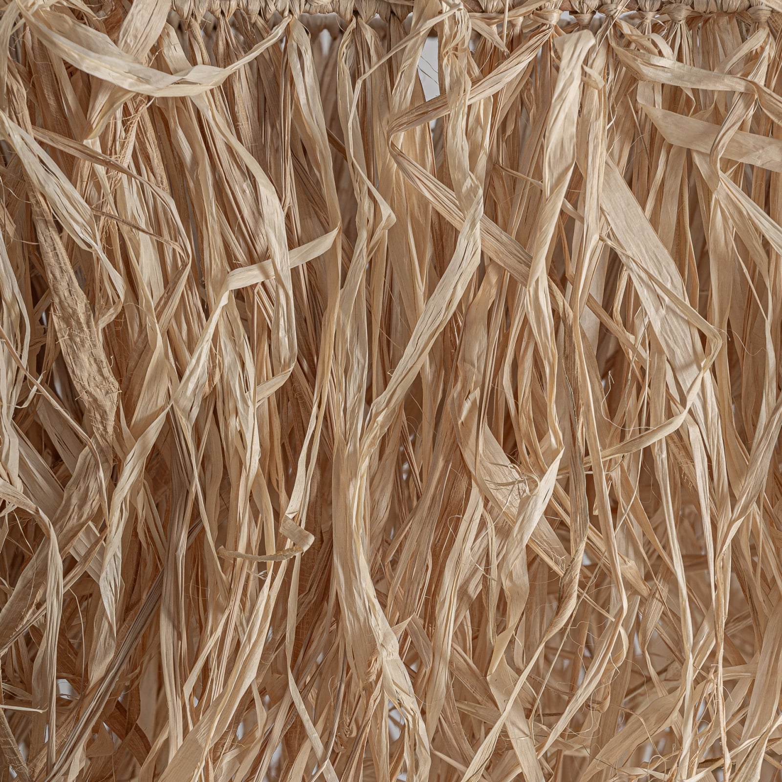 Lustra Ceiling transformă plafonul într-un element scenic: o bandă generoasă de rafie cu franjuri liberi care cad în valuri, oferind o prezență organică, caldă și foarte decorativă. Designul este inspirat din estetica boho contemporană și pune accent pe textura naturală și mișcarea fibrelor, creând o lumină ambientală difuză și o atmosferă primitoare.