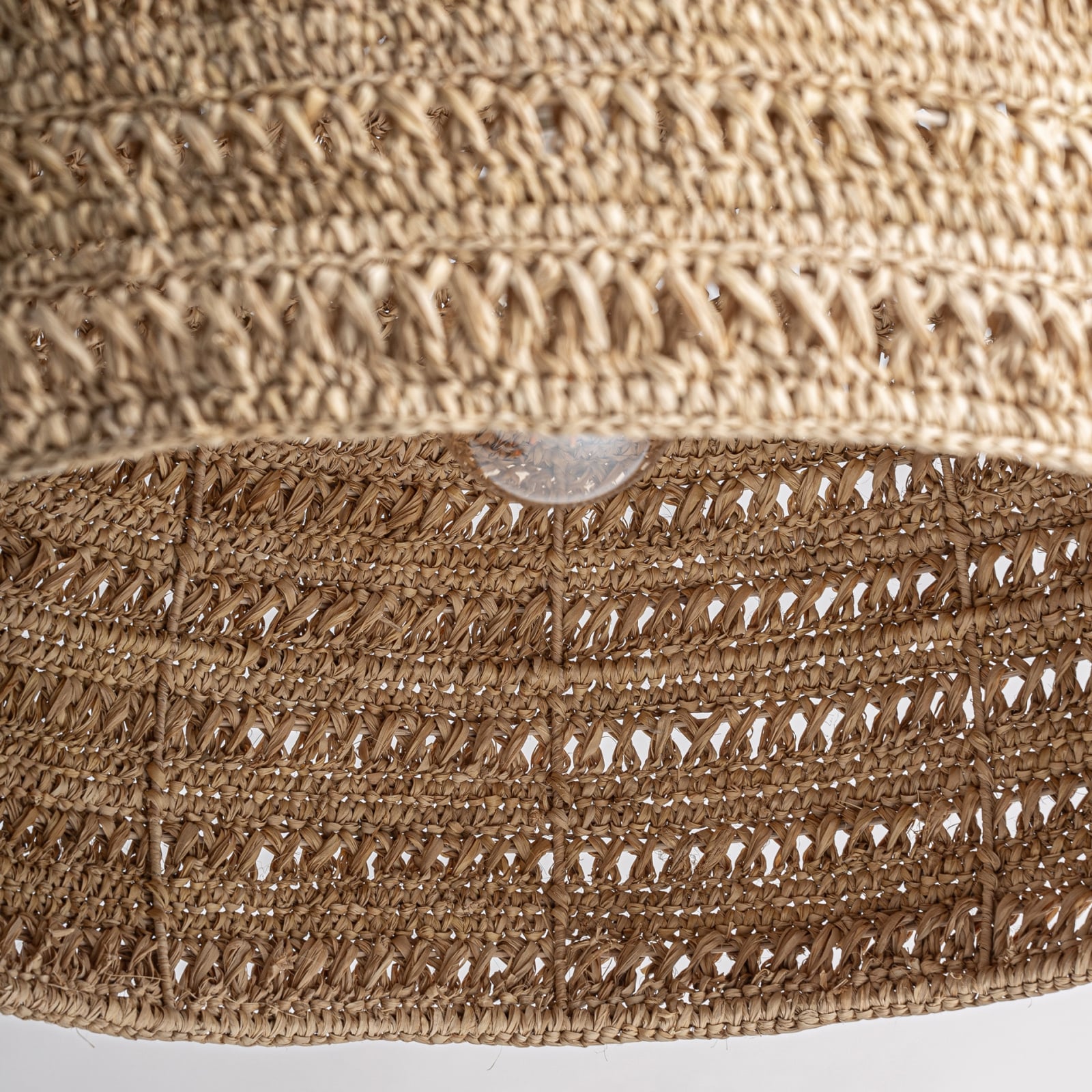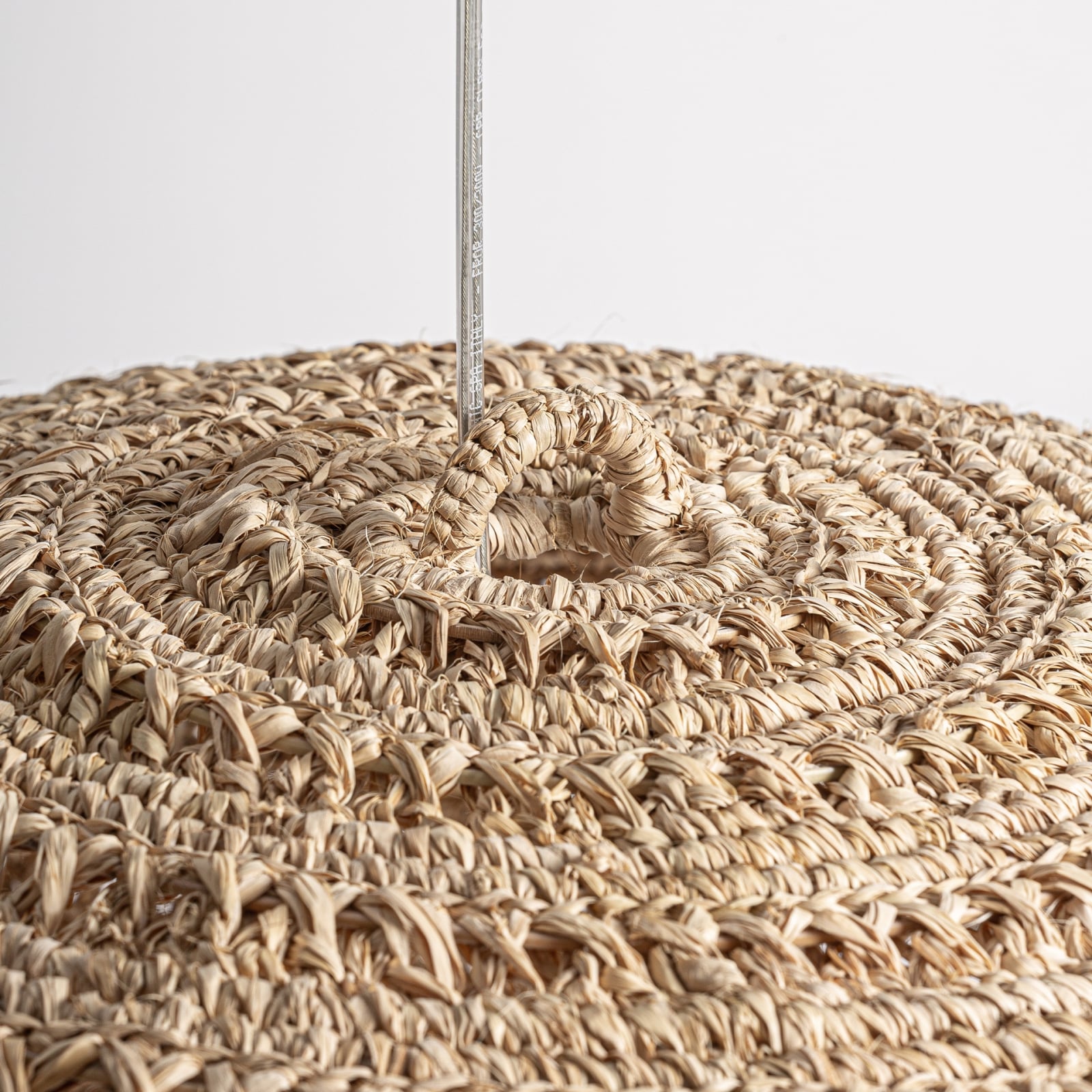 Dimensiuni totale: 77 x 77 x 43 cm Material: fibră naturală culoare maro Greutate: 2,5 kg Soclu: E27 | Putere maximă recomandată: 40 W | Număr becuri: 1 Dimensiune embelisher: 7 x 7 x 7 cm Lungime cablu: 100 cm (transparent) Alimentare: 220–240 V, 50–60 Hz Include: portalampă transparent Nu include: becAbajurul semicircular este lucrat integral din fibre naturale împletite, rezultând o textură densă care difuzează lumina într-o manieră blândă. Profilul rotund și marginile ușor neregulate îi conferă o siluetă caldă, care funcționează ca element decorativ în sine, chiar și atunci când lampa este stinsă.