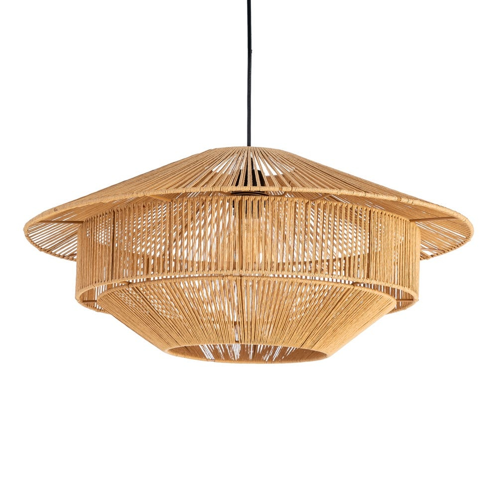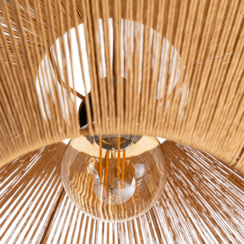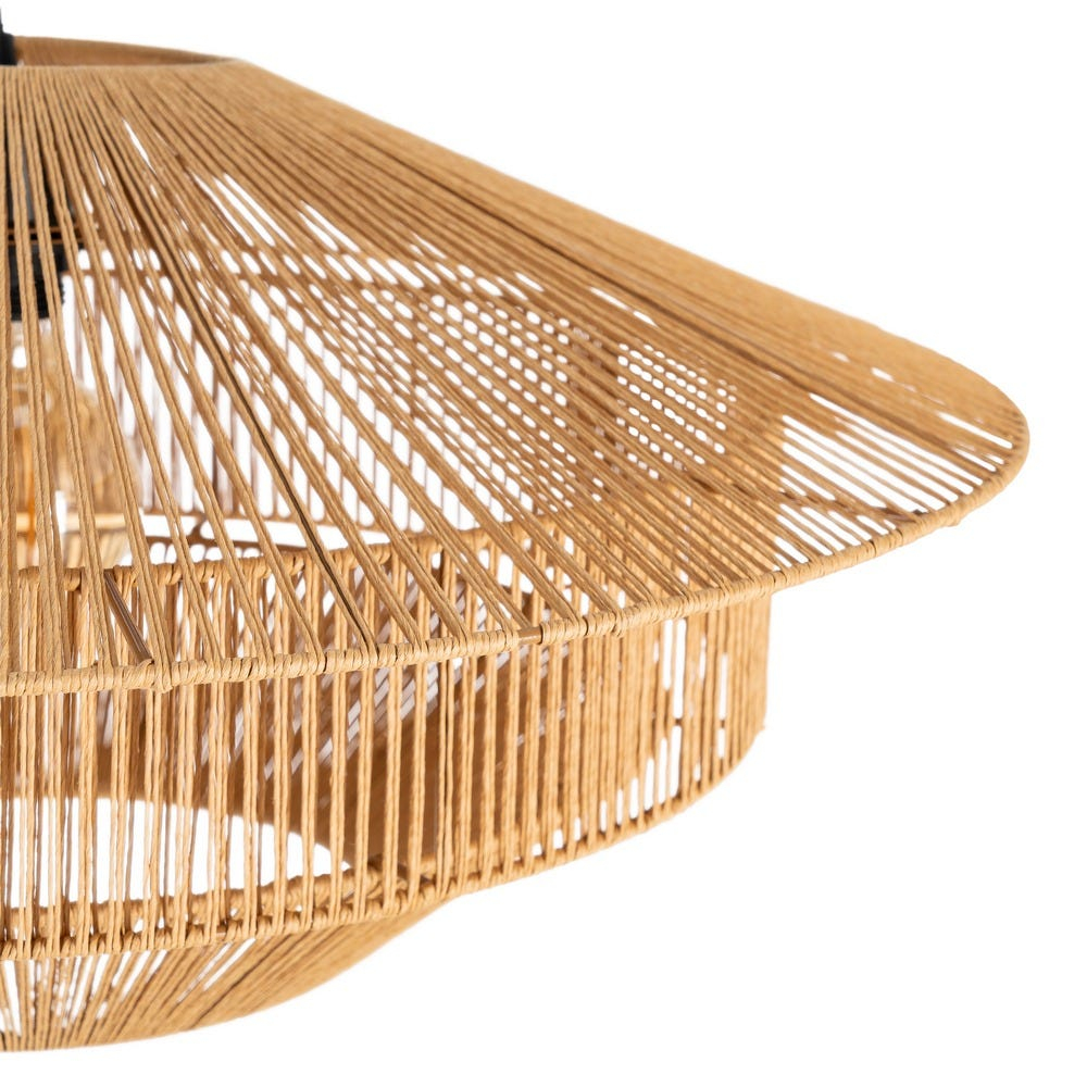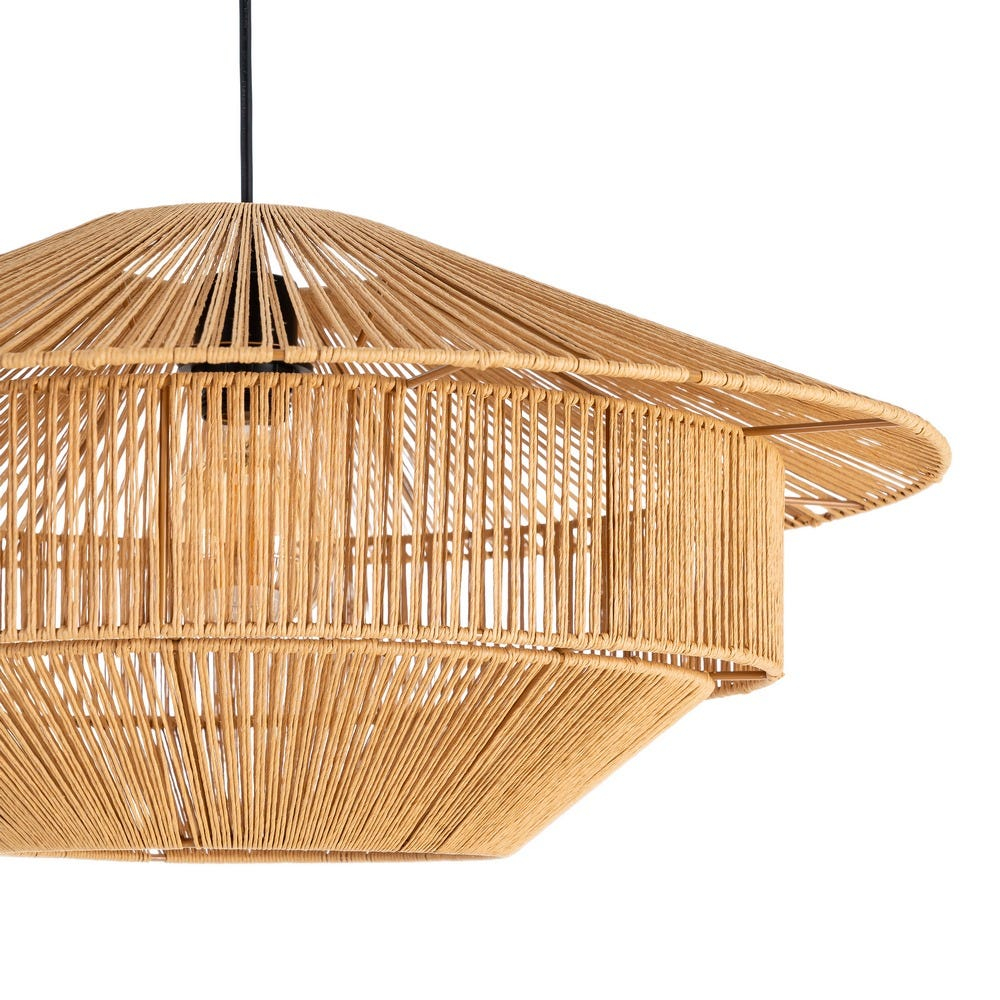 Structura metalică oferă stabilitate, în timp ce împletitura densă din sfoară de hârtie naturală filtrează lumina într-un mod subtil și cald. Forma sa geometrică inspirată de designul japonez minimalist transformă lampa într-un punct focal elegant deasupra mesei de dining, în living sau dormitor.