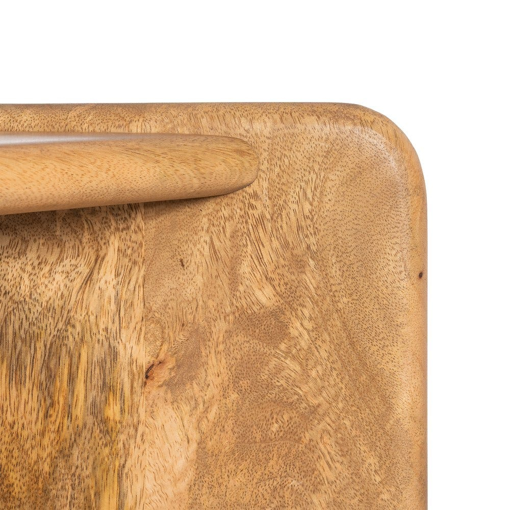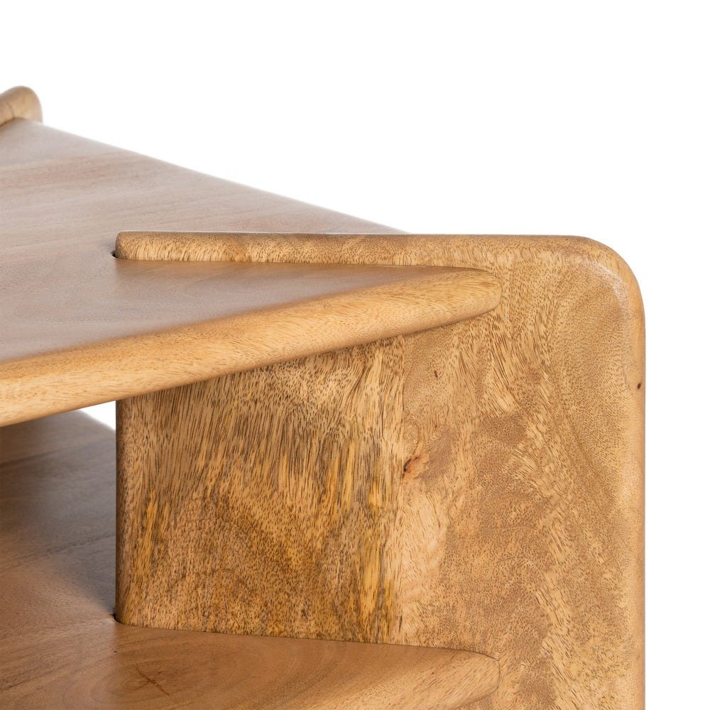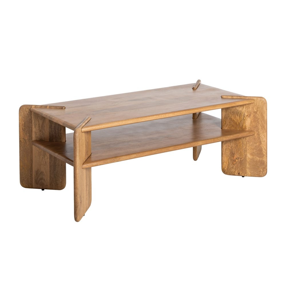 Prin combinatia dintre blat si raft, masa serveste atat ca suport pentru tavi si cani, cat si ca spatiu util pentru reviste ori telecomenzi; totodata, finisajul natural al lemnului de mango se potriveste cu textile neutre si cu decoruri in registru japandi, scandinav sau mediteranean minimal, iar integrarea langa o canapea in nuante deschise se face firesc.