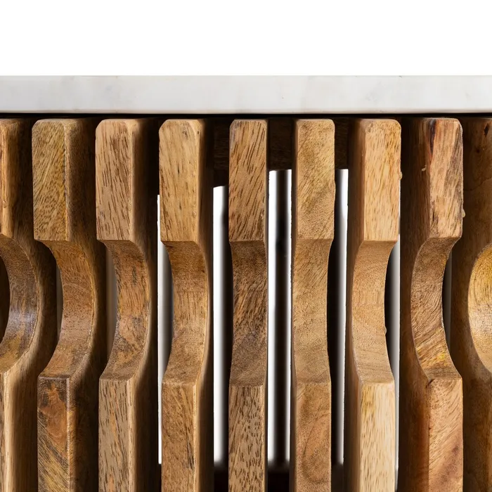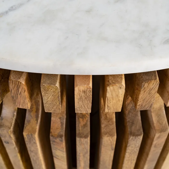 O masă de cafea rotundă din lemn și marmură ce emană rafinament și naturalețe, ideală pentru livingurile moderne cu influențe mediteraneene sau boho-chic. Blatul din marmură autentică, cu texturi unice, este completat de o bază lucrată din lamele de lemn de mango ce creează un joc armonios de linii și lumini.