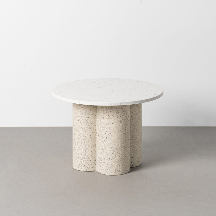 Nu este doar o masă de cafea, ci o piesă care definește zona de living prin formă și textură. Blatul rotund, cu finisaj alb inspirat de marmură, reflectă discret lumina, iar baza compusă din coloane cilindrice creează un efect arhitectural modern și echilibrat.