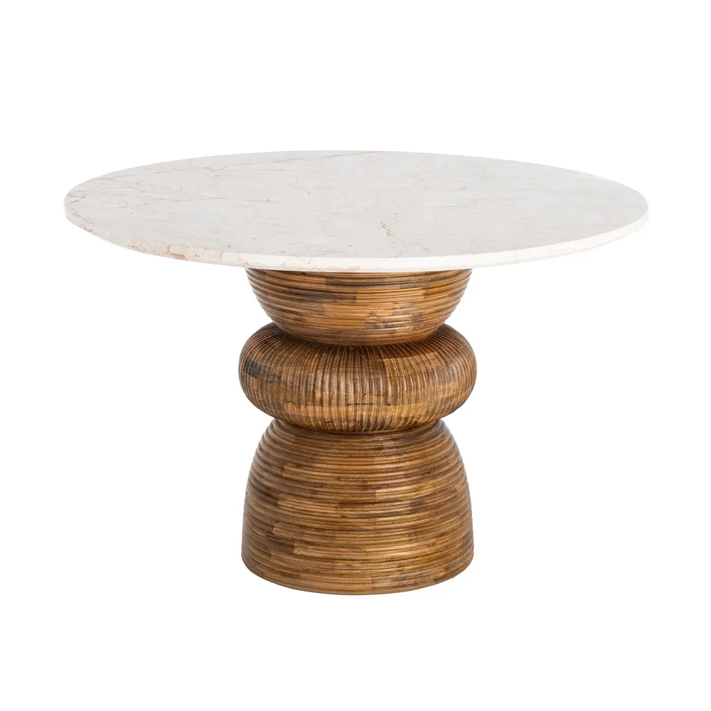 Această masă de dining nu este doar locul în care iei masa, ci punctul în jurul căruia se adună întreaga atmosferă a încăperii. Blatul din marmură în tonuri alb crem aduce lumină și rafinament vizual, în timp ce baza din lemn de mango maro, cu formă sculpturală, oferă profunzime și o prezență care se face remarcată fără să fie apăsătoare.