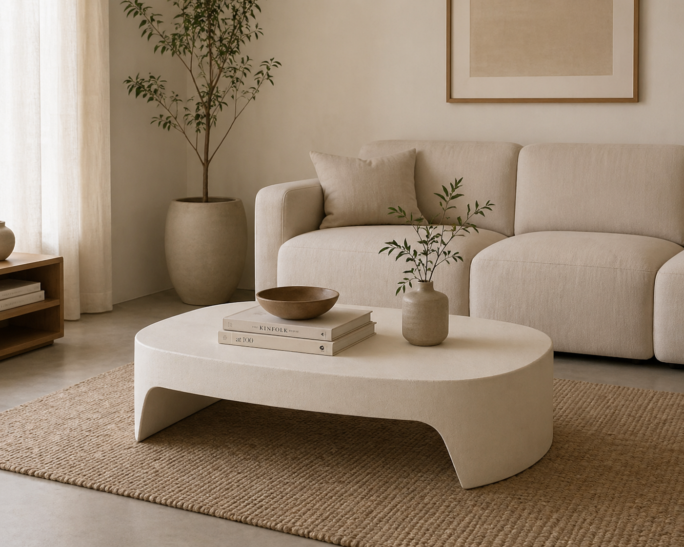 Forma joasă contribuie la o atmosferă relaxată, potrivită pentru momentele de zi cu zi. În același timp, finisajul ușor texturat adaugă profunzime și face ca piesa să rămână interesantă chiar și fără multe obiecte decorative.