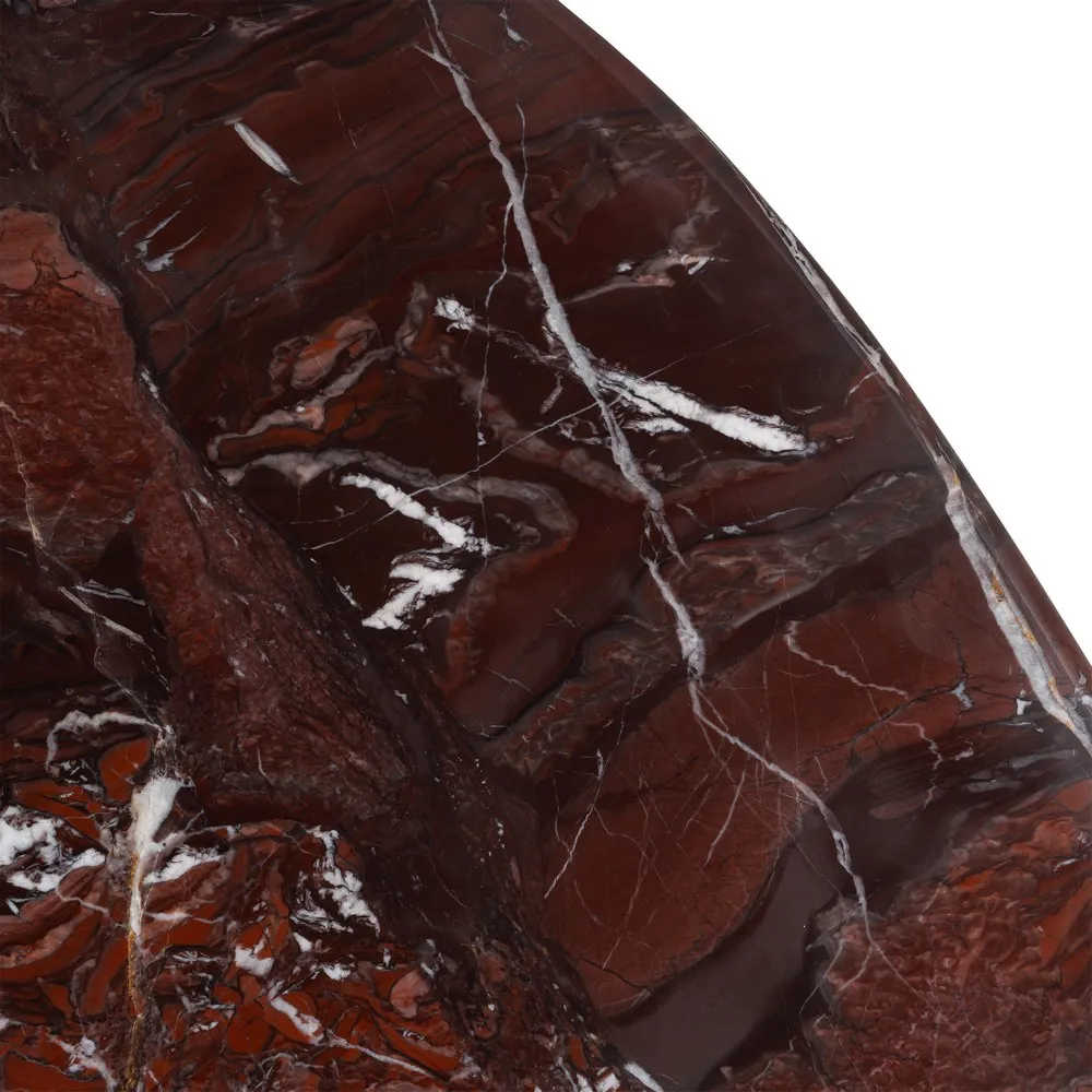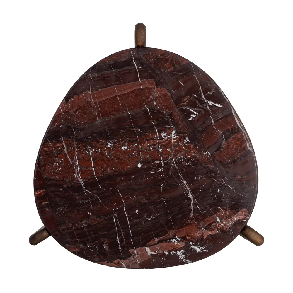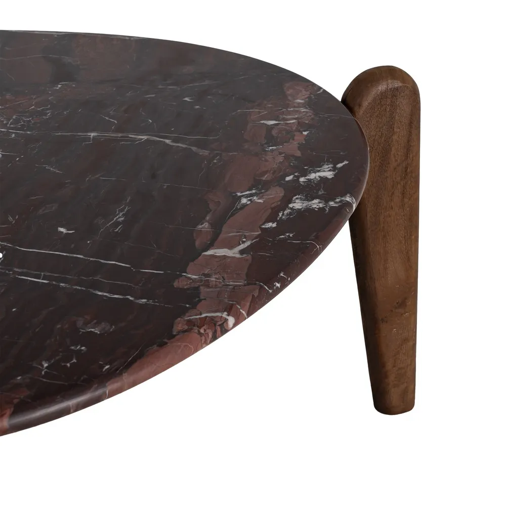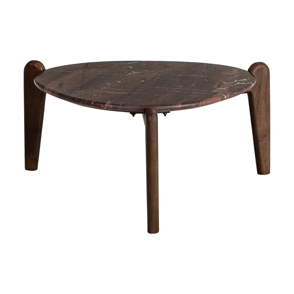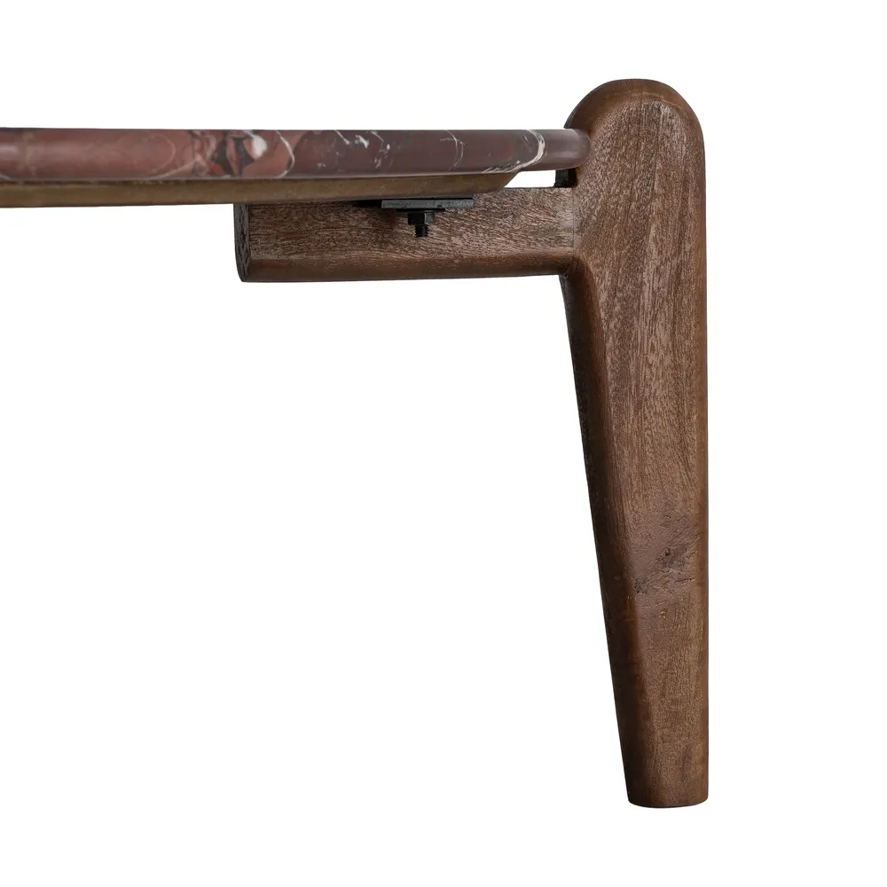 Măsuța de cafea cu blat de marmură pe picioare din lemn de mango propune linii organice și un contrast material cald-rece. Forma atipică a blatului pune în valoare venatura marmurei. Picioarele robuste din mango susțin sigur masa în utilizarea zilnică.