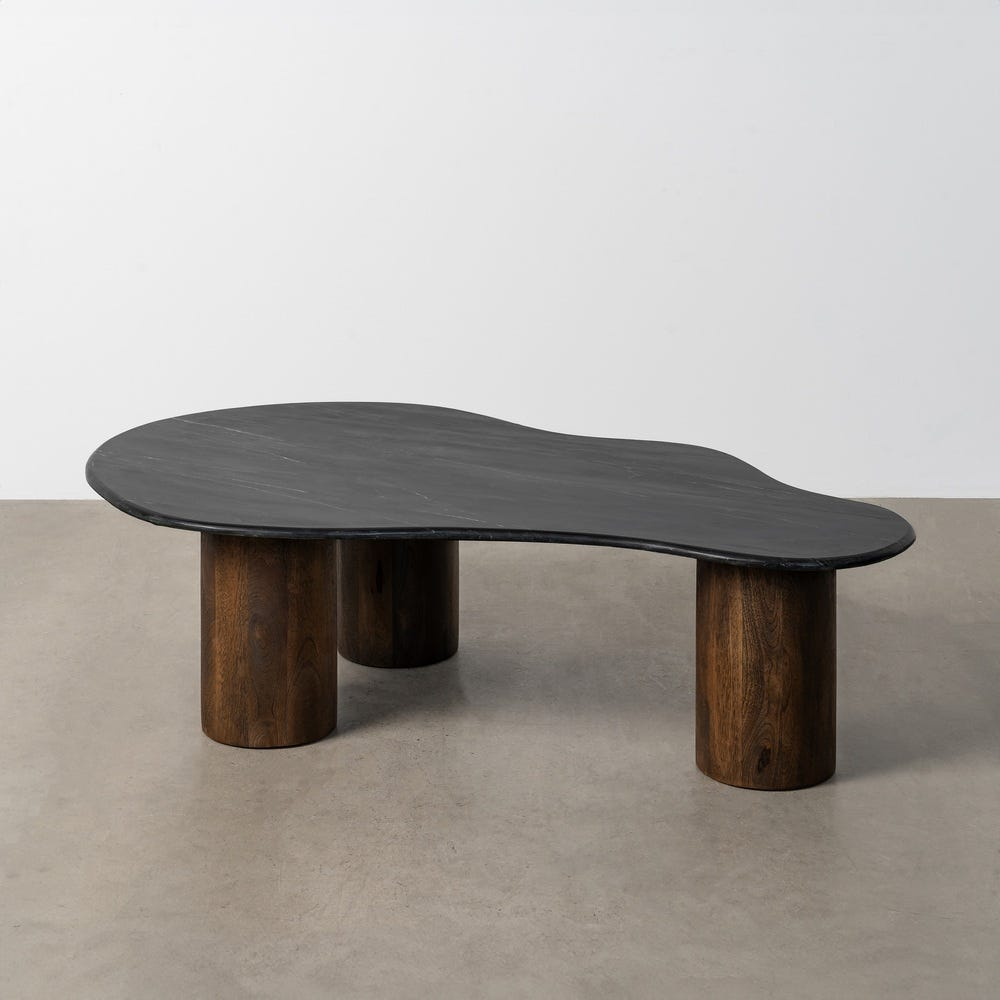 Măsuța de cafea din marmură neagră cu bază din lemn de mango ancorează livingul prin siluetă sculpturală și contrast elegant. Blatul organic din marmură evidențiază venatura naturală. Picioarele cilindrice din mango oferă stabilitate și caracter.