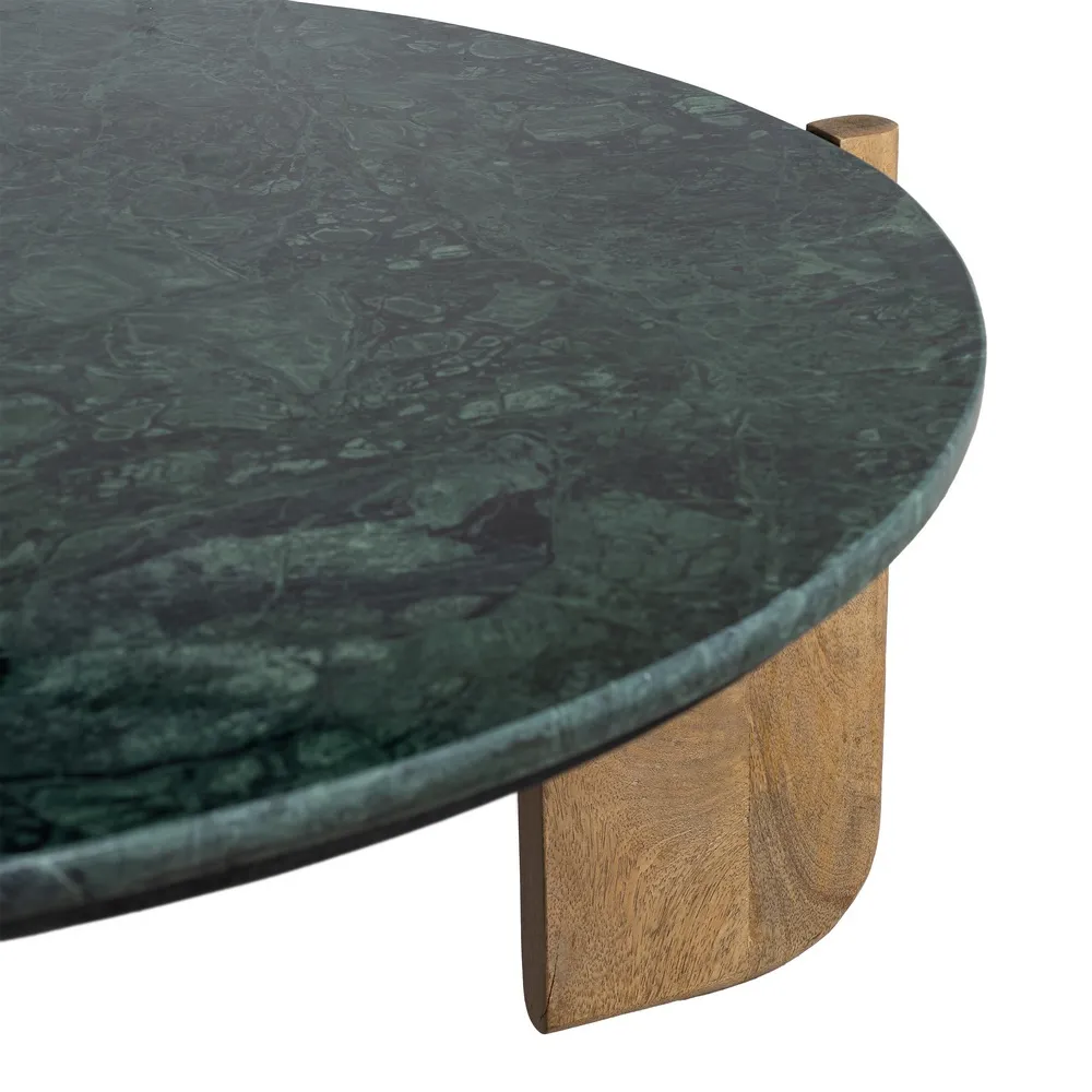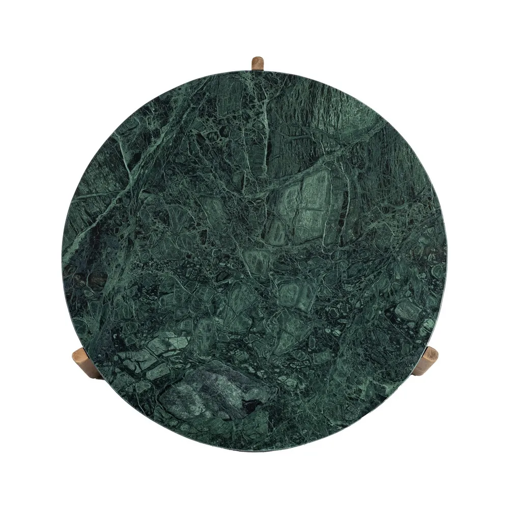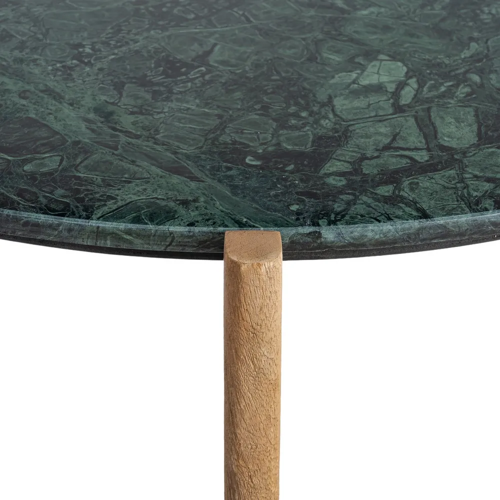 Această măsuță de cafea rotundă combină eleganța naturală a marmurei verzi cu designul cald și sculptural al picioarelor din lemn de mango. Blatul rotund evidențiază venatura bogată a marmurei și adaugă profunzime cromatică spațiului, în timp ce cele trei picioare din mango oferă stabilitate și volum vizual. Măsuța are înălțimea de 35 cm și greutatea de 8 kg, fiind ușor de integrat în orice living, zona de relaxare sau birou. Este o piesă de design care combină funcționalitatea cu estetica luxoasă.
