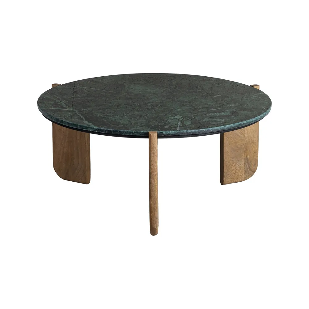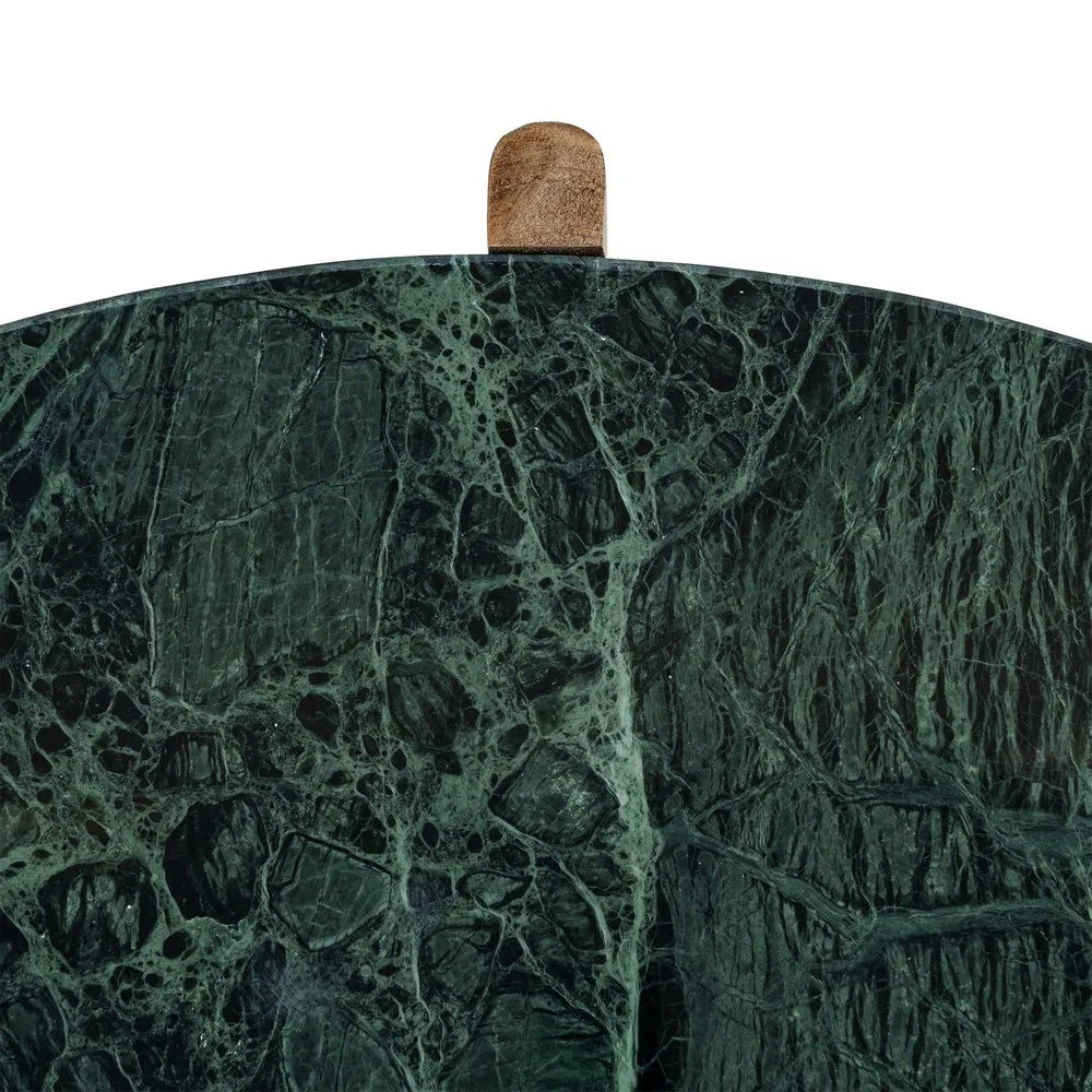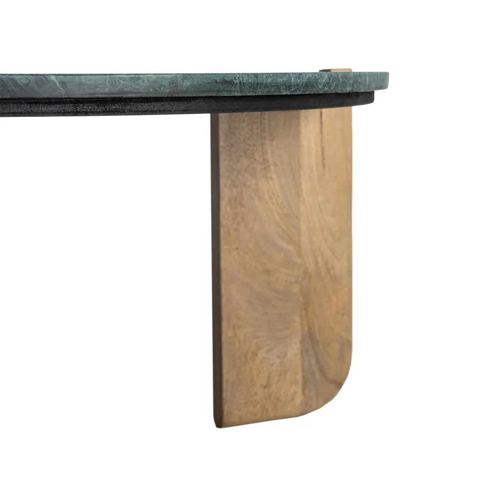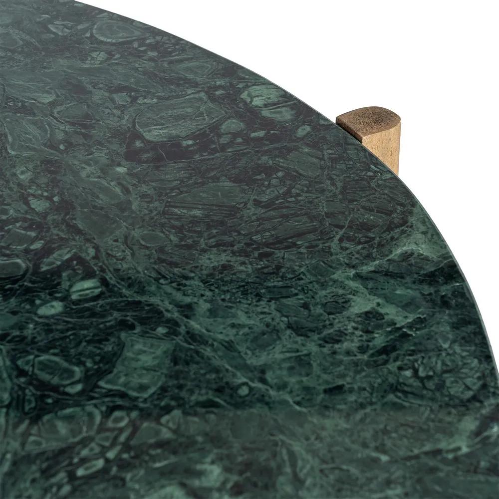 Această măsuță de cafea rotundă combină eleganța naturală a marmurei verzi cu designul cald și sculptural al picioarelor din lemn de mango. Blatul rotund evidențiază venatura bogată a marmurei și adaugă profunzime cromatică spațiului, în timp ce cele trei picioare din mango oferă stabilitate și volum vizual. Măsuța are înălțimea de 35 cm și greutatea de 8 kg, fiind ușor de integrat în orice living, zona de relaxare sau birou. Este o piesă de design care combină funcționalitatea cu estetica luxoasă.