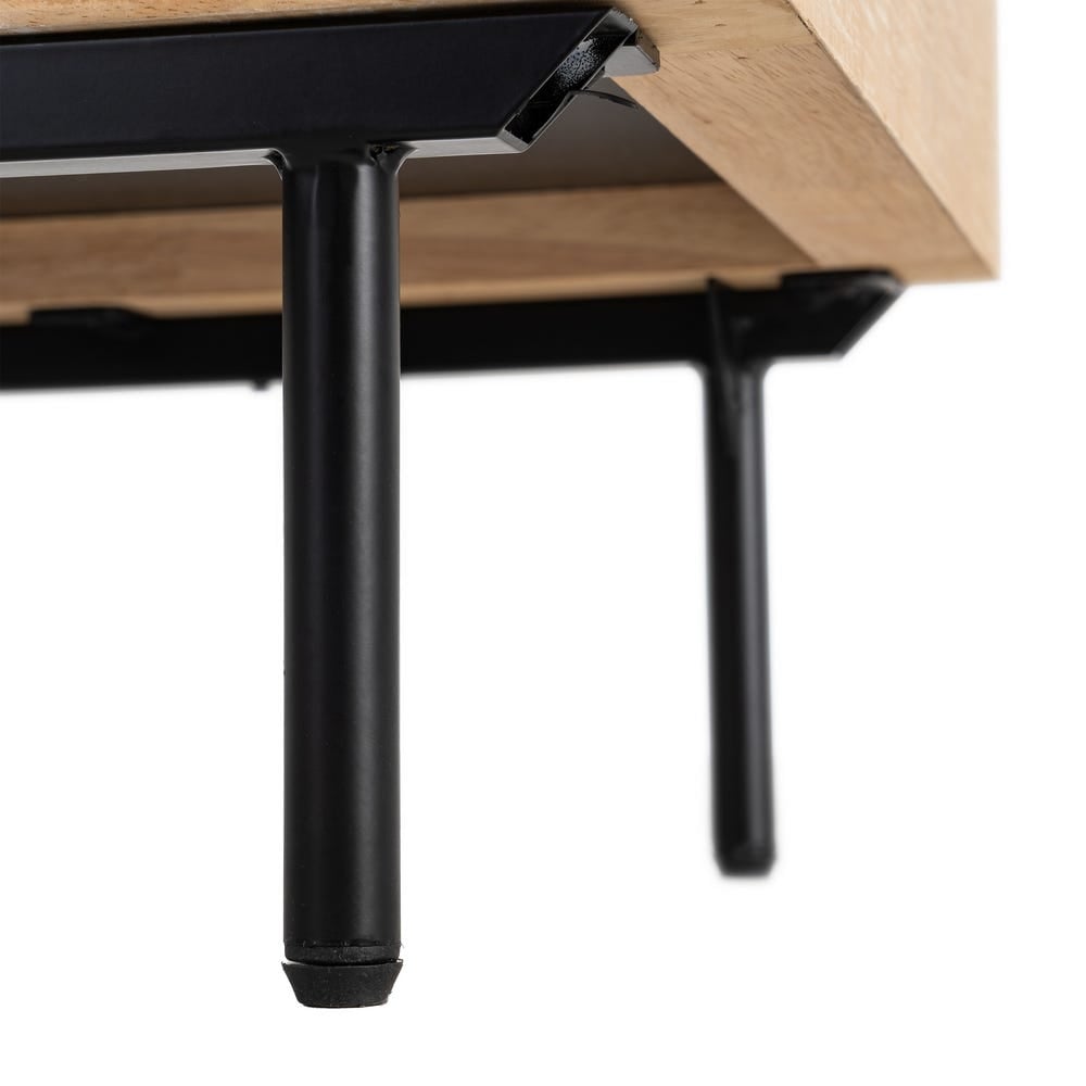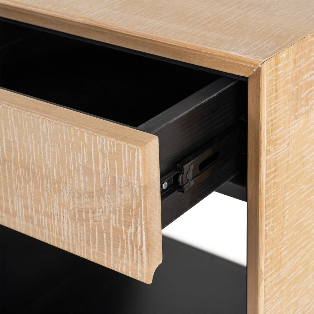 Cadrul din lemn de cauciuc cu textură naturală este pus în valoare de interiorul negru mat, creând un contrast grafic plăcut. Sertarul ascunde accesoriile mărunte, iar nișa oferă spațiu la îndemână pentru cărți, dispozitive sau cutii decorative.