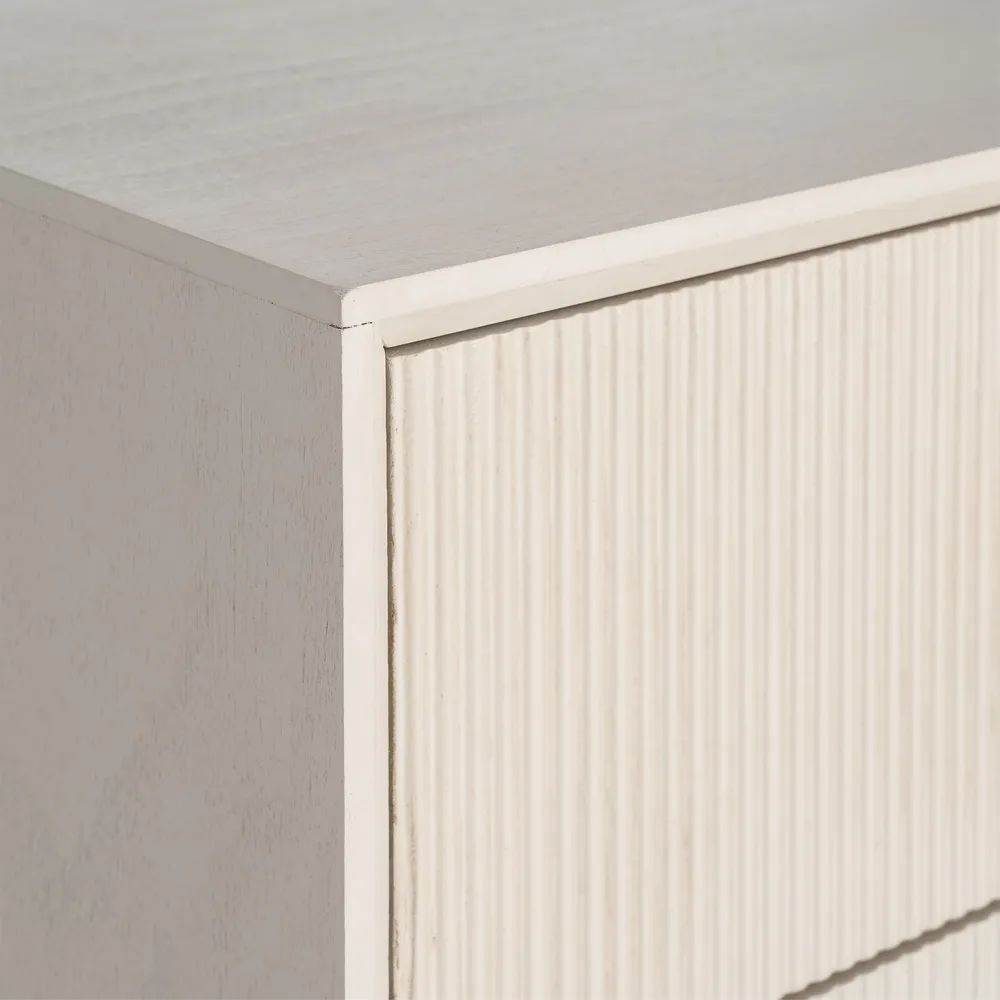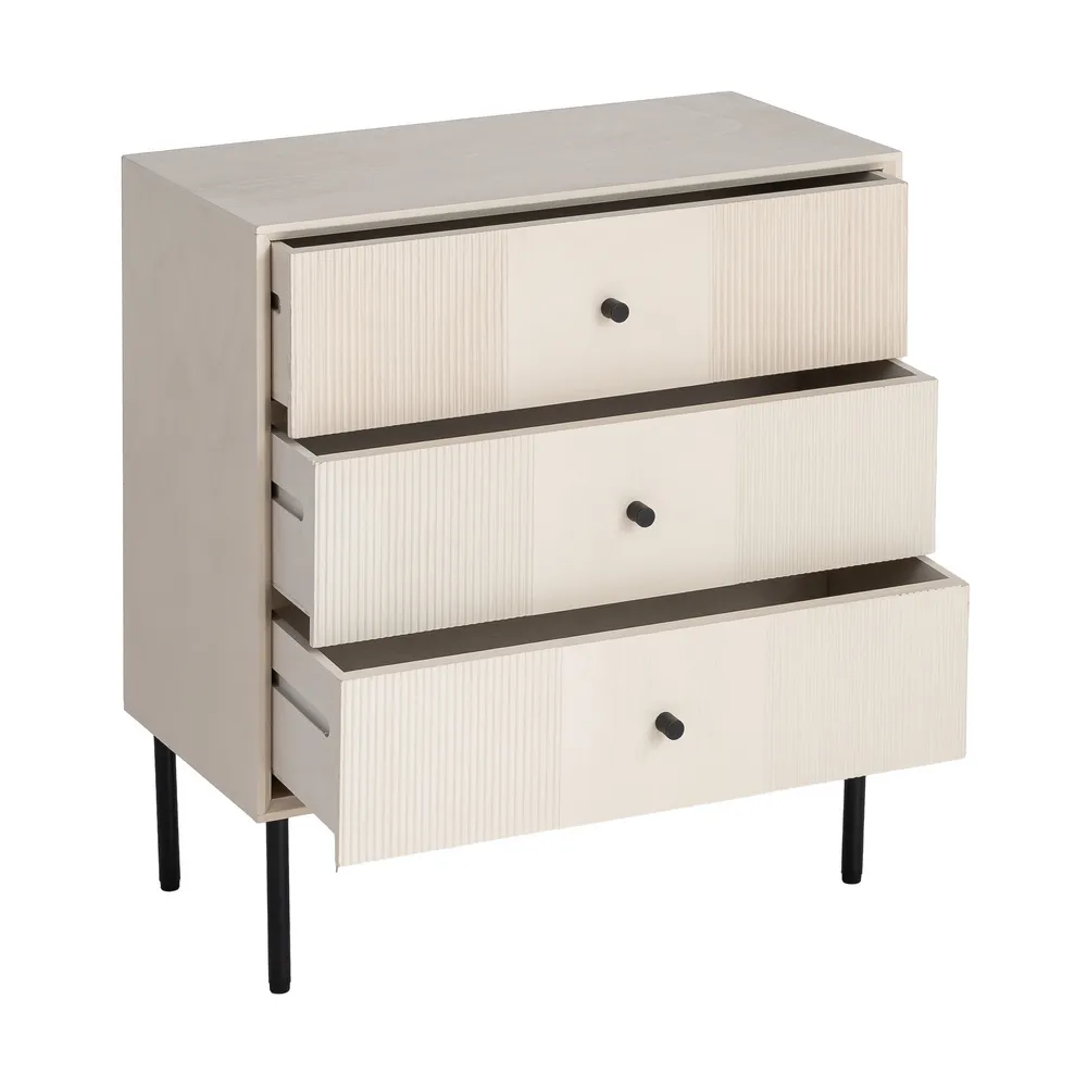 Corpul noptierei este realizat din MDF și este prevăzut cu trei sertare spațioase, fiecare dotat cu mâner discret. Fronturile sertarelor prezintă un relief vertical fin, care adaugă profunzime vizuală și ritm suprafeței, fără a încărca designul.