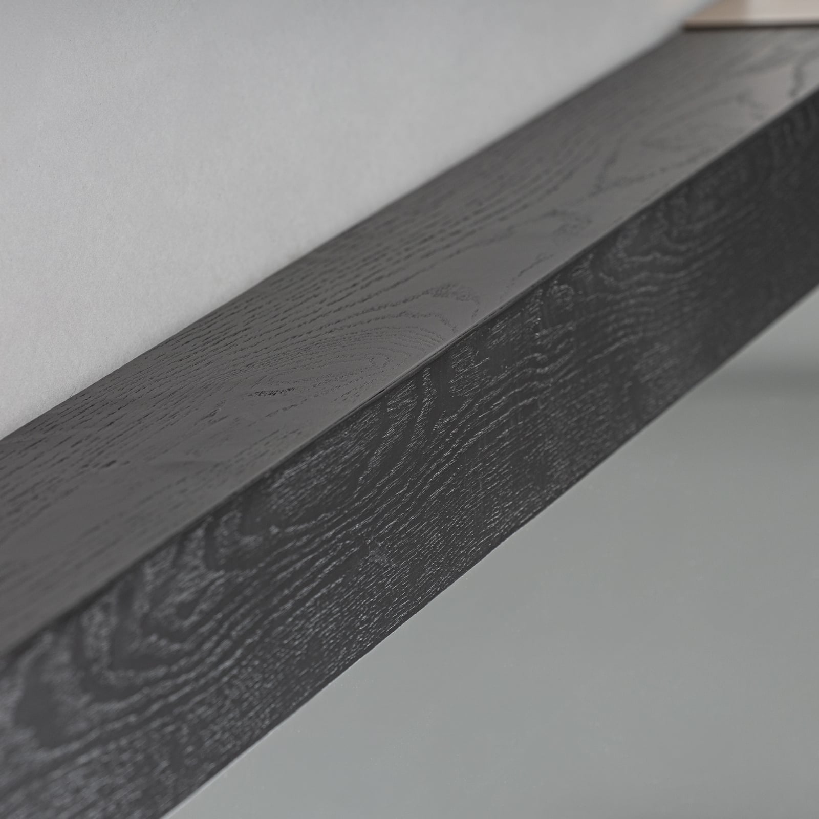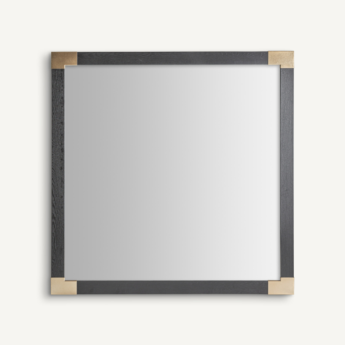 Rama din frasin vopsit negru conturează o suprafață generoasă care se susține vizual prin proporții echilibrate, în timp ce colțurile metalice aurii marchează punctele cardinale ale piesei și îi conferă un detaliu prețios. Textura lemnului, finisajul intens și contrastul dintre negru și auriu creează o prezență arhitecturală ce funcționează ca punct focal pe un perete liber.