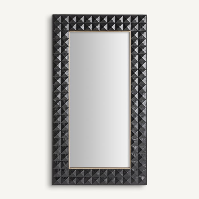 Dimensiuni totale: 200 x 7.5 x 111 cm Lățime ramă: 20 cm Dimensiune lună: 71 x 160 cm Greutate: 44.4 kg Materiale: lună oglindă, ramă din frasin vopsit negru, detaliu din metal cu finisaj auriu Mod de ancorare: inel de prindere inclus Poziție ancorare: orizontală și verticală Include: sistem de ancorare pentru pereteRama cu relief facetat și finisaj negru conferă piesei o personalitate arhitecturală, jucând cu lumina și umbra la fiecare mișcare a privitorului. Detaliile aurii subliniază marginile unei oglinzi generoase, echilibrând gravitatea ramei cu un accent glam care amplifică luxul discret al designului.