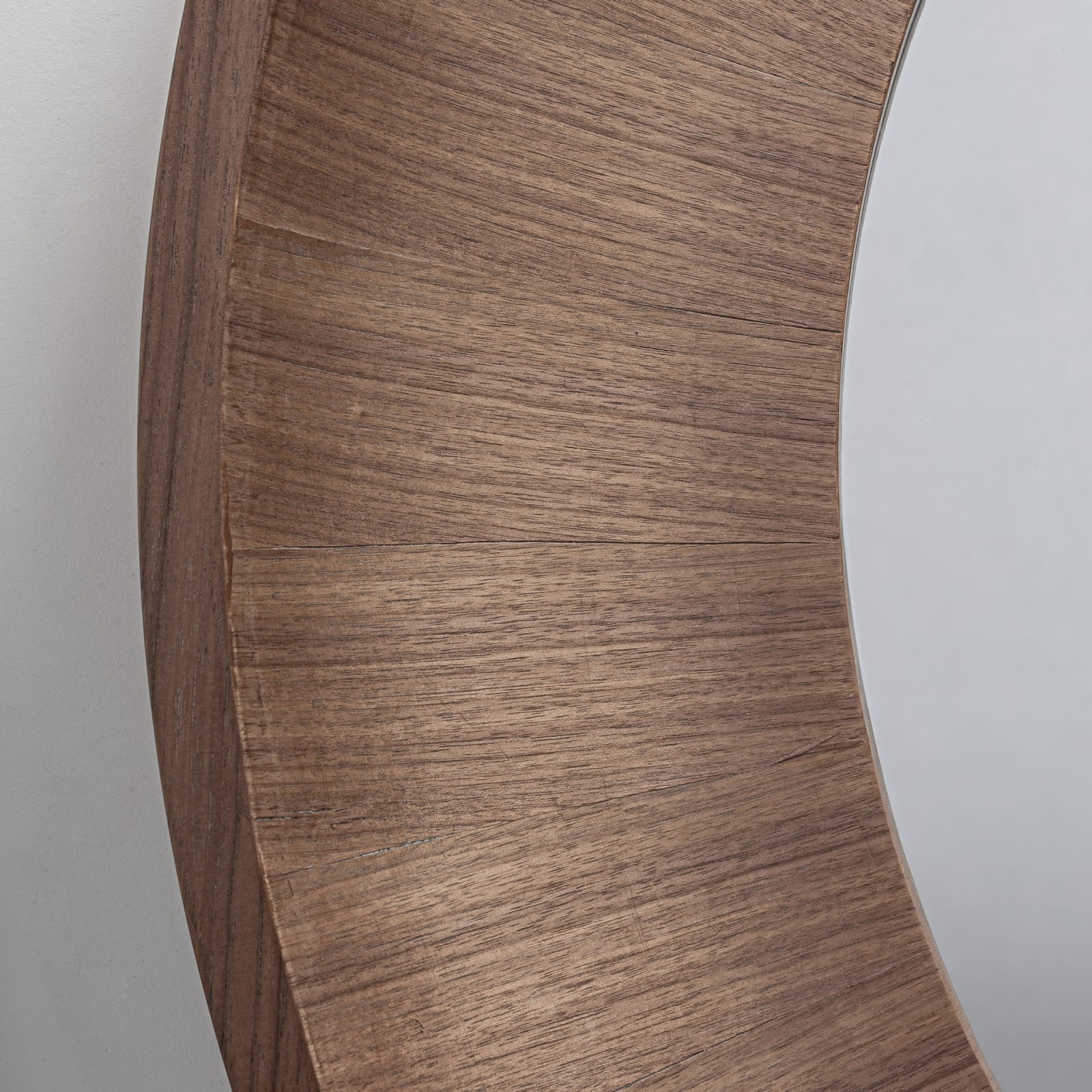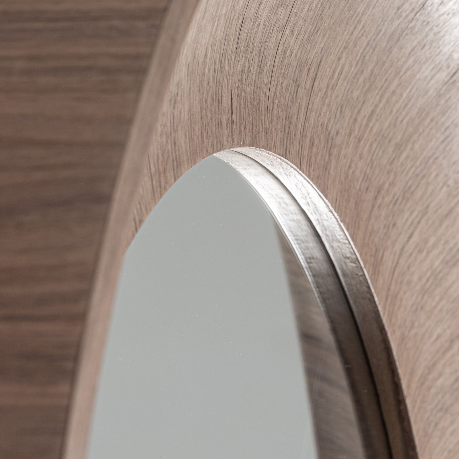 Rama rotundă, acanalată, conturează un relief concentric care propune un joc subtil de lumină și umbră; textura furnirului de nuc în nuanță maro deschis conferă profunzime și o senzație tactilă caldă. Profilul generos al ramei (17,50 cm) oferă volum fără a aglomera vizual, transformând oglinda într-un punct focal armonios.