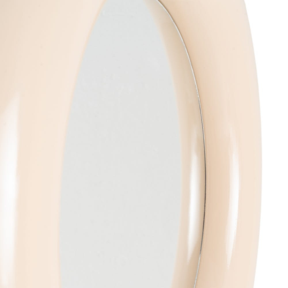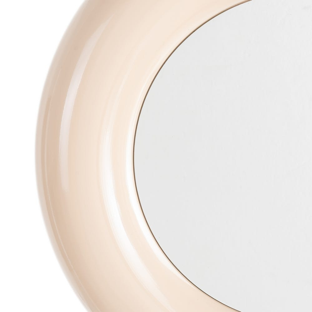 Oglindă rotundă din metal bej cu ramă generoasă, lucioasă, creată pentru decorarea pereților din living, hol sau dormitor. Tonul cald de bej se integrează natural în scheme neutre și aduce un plus de lumină și profunzime spațiului.