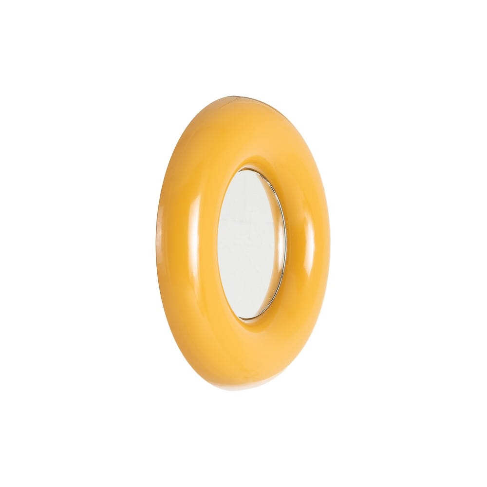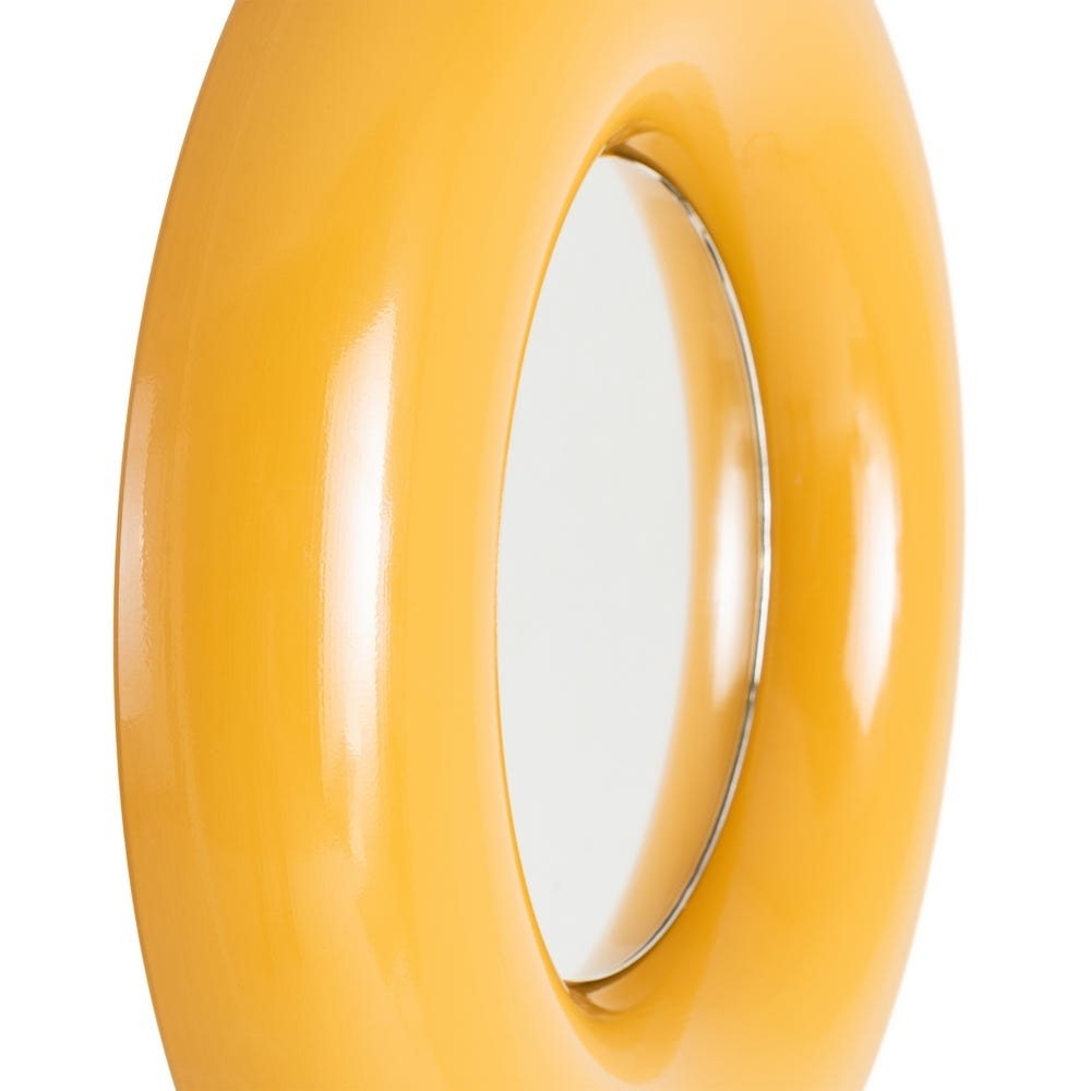 Oglindă rotundă din metal muștar pentru decorul pereților din living, hol sau dormitor, cu ramă volumetrică lucioasă care adaugă un accent modern și energic într-o compoziție contemporană.