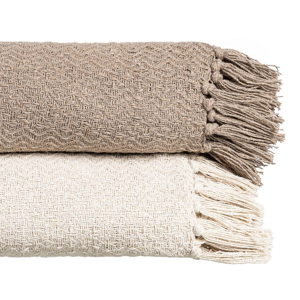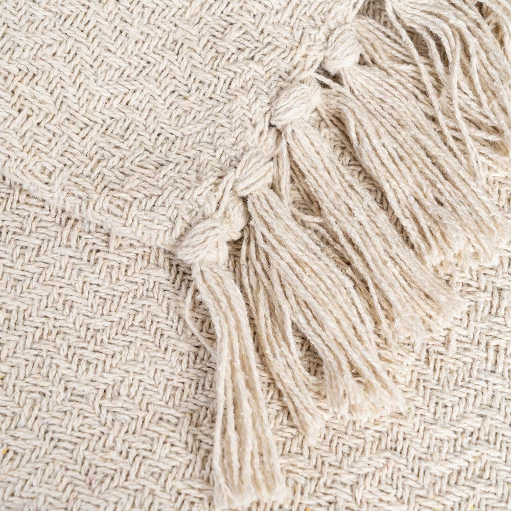 Această pătură bej deschis din bumbac și poliester este o piesă textilă versatilă pentru living sau dormitor. Dimensiunea generoasă de 180 x 270 cm permite acoperirea canapelei sau a patului, iar textura țesută vizibilă și franjurii integrați adaugă un detaliu decorativ discret.