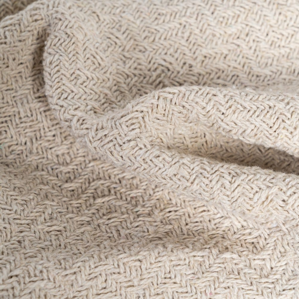 Compoziția din bumbac și poliester reciclat, alături de gramajul de 320 gr/mp, susține o structură densă. Nuanța bej deschis permite integrarea ușoară în decoruri în tonuri neutre sau naturale.
