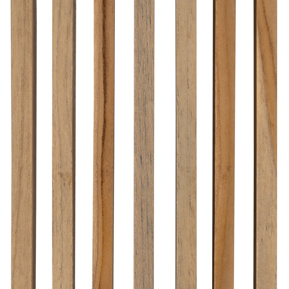 Raftul din lemn de tec reciclat în profil „waterfall” curbează vizual muchia într-un „L” continuu, iar ritmul șipcilor canelate tip baguette adaugă finețe grafică. Textura tecului, cu fibre și nuanțe naturale, încălzește peretele și, în același timp, oferă o suprafață stabilă pentru cărți, ceramică sau mici obiecte decorative.