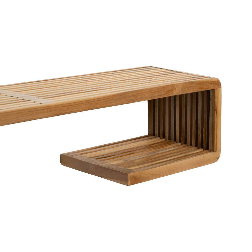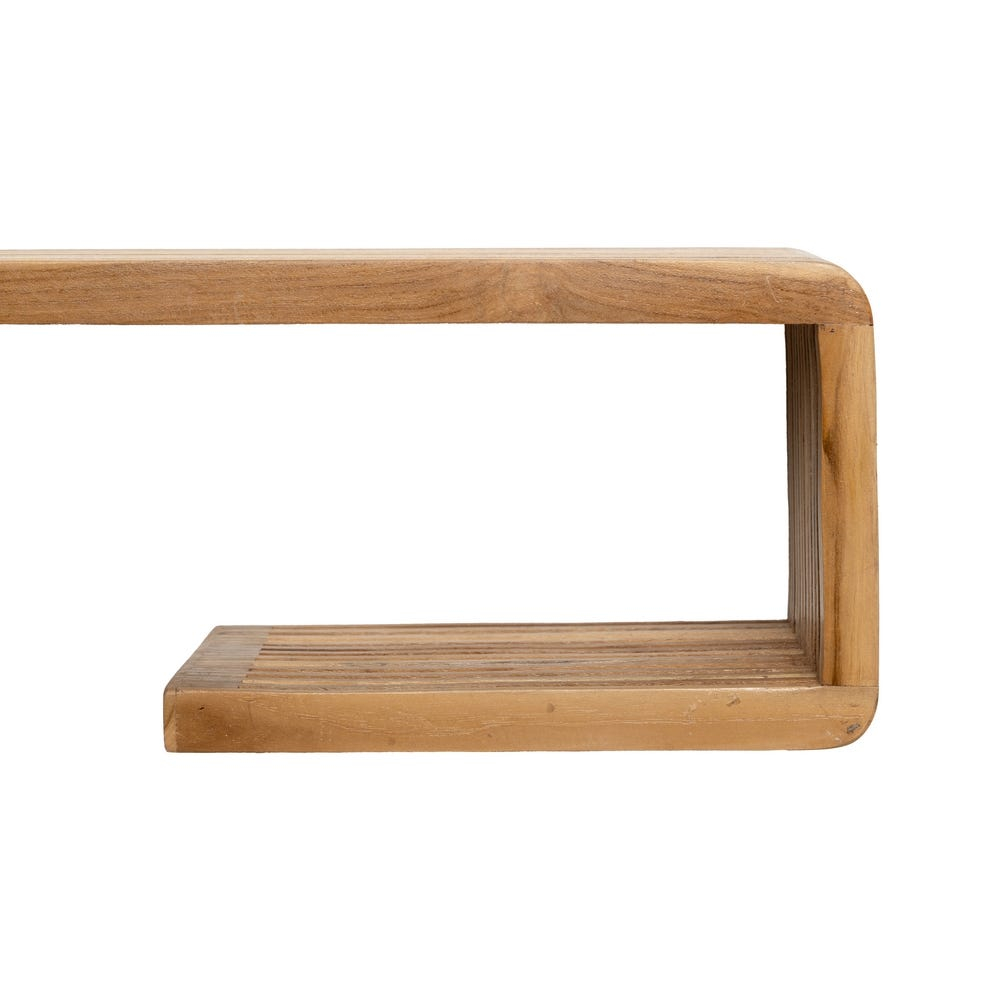 Raft de perete din lemn de tec reciclat waterfall cu șipci canelate tip baguette care îmbină o linie fluidă în “L” cu un ritm plăcut al șipcilor. Textura nobilă a tecului pune în valoare obiectele expuse și, în același timp, aduce căldură naturală pereților, integrându-se firesc în amenajări japandi, scandinave sau modern naturale.