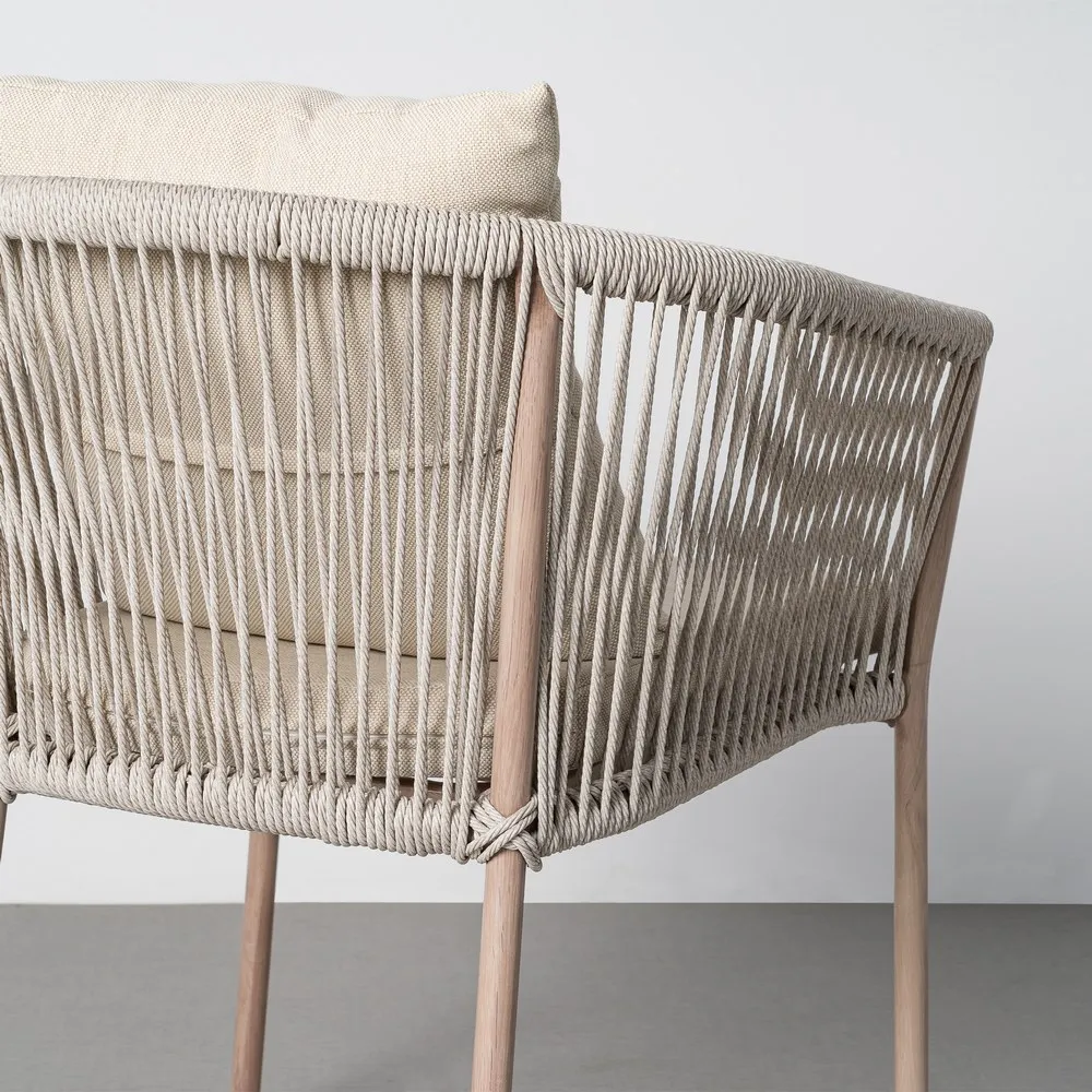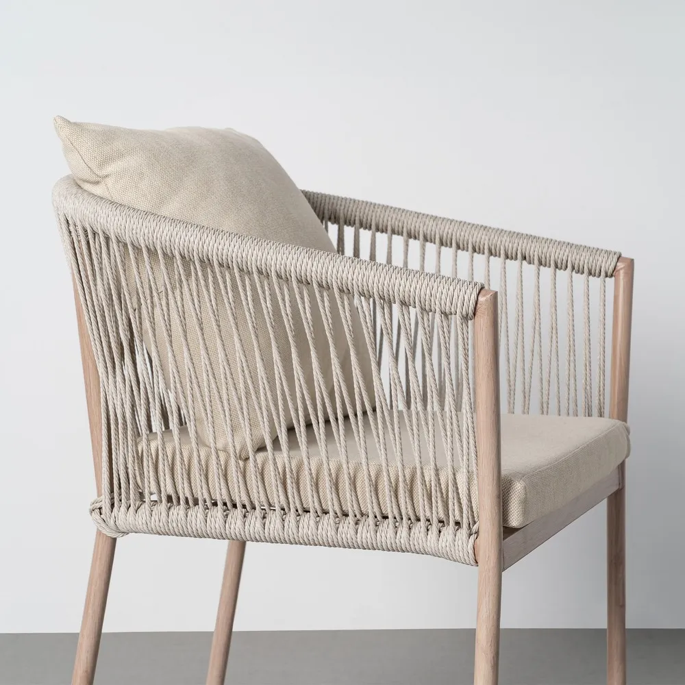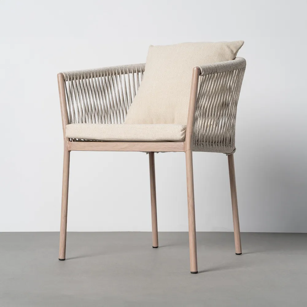 Spătarul rotunjit, realizat din ratan sintetic tensionat vertical, creează o siluetă fluidă și aerisită, în timp ce perna de șezut și perna de spate în nuanță deschisă completează vizual ansamblul și sporesc confortul. Structura metalică subțire menține un profil elegant, potrivit amenajărilor outdoor contemporane.
