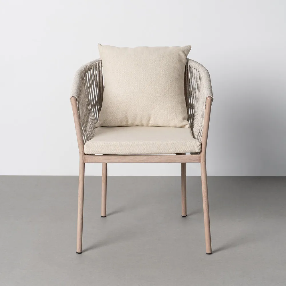Cu un design primitor și linii rotunjite, acest scaun pentru exterior și HoReCa se remarcă prin spătarul curbat din ratan sintetic bej și perna generoasă care adaugă confort suplimentar. Structura din oțel susține întreaga compoziție, oferind stabilitate și un aspect echilibrat, potrivit pentru terase elegante și spații de dining profesionale.