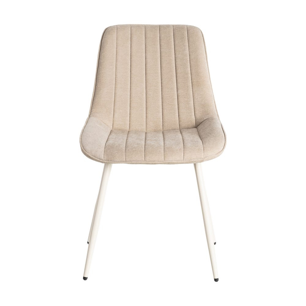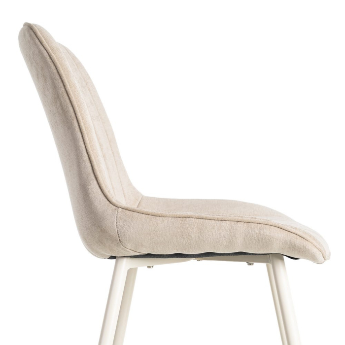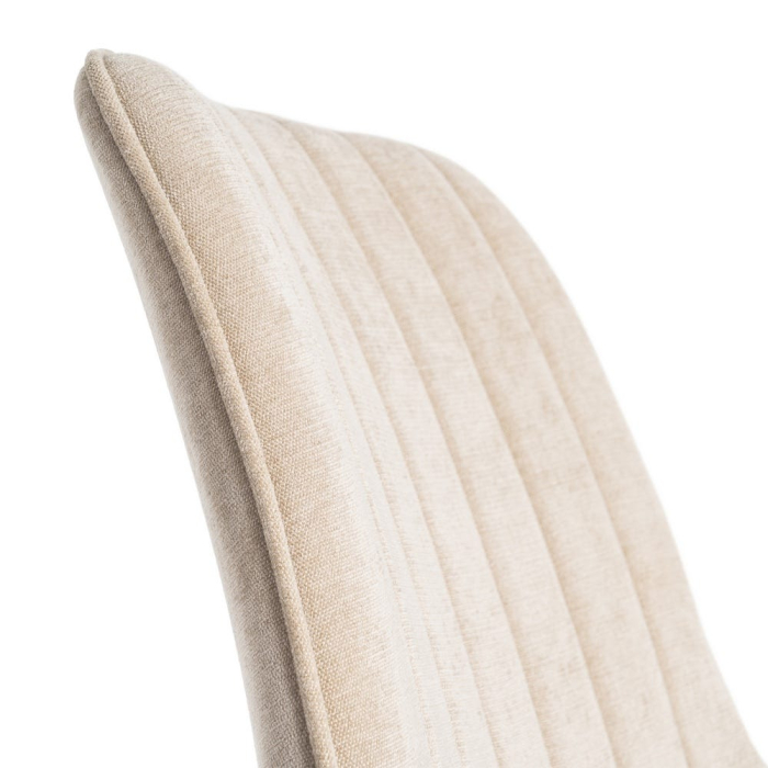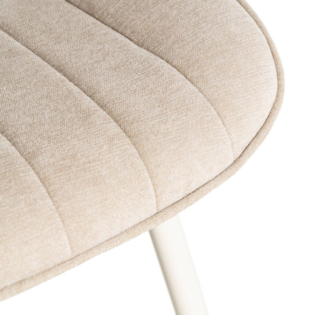 Profilul curbat al șezutului susține postura naturală, în timp ce culoarea bej luminează discret compoziția și se combină ușor cu lemn deschis sau piatră caldă.