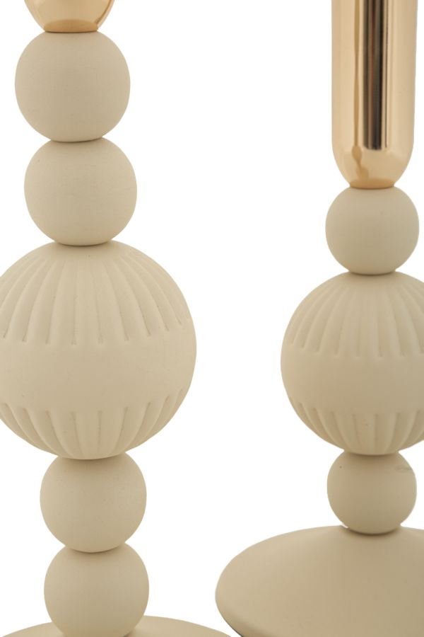 Acest set de sfeșnice atrage atenția prin designul său modern și echilibrat, realizat din sfere suprapuse care conferă armonie și originalitate. Finisajul crem mat se îmbină elegant cu detaliile aurii ale suportului pentru lumânare, iar împreună creează un obiect decorativ versatil, potrivit pentru diverse stiluri interioare.