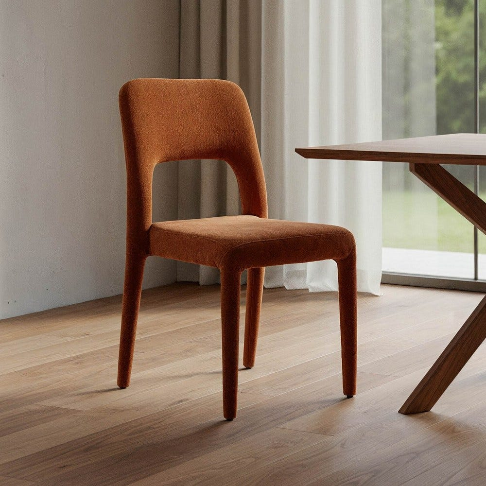 Set de 4 scaune de dining portocalii din stofă cu structură metalică – soluția perfectă pentru a aduce căldură și vitalitate în decorul tău.