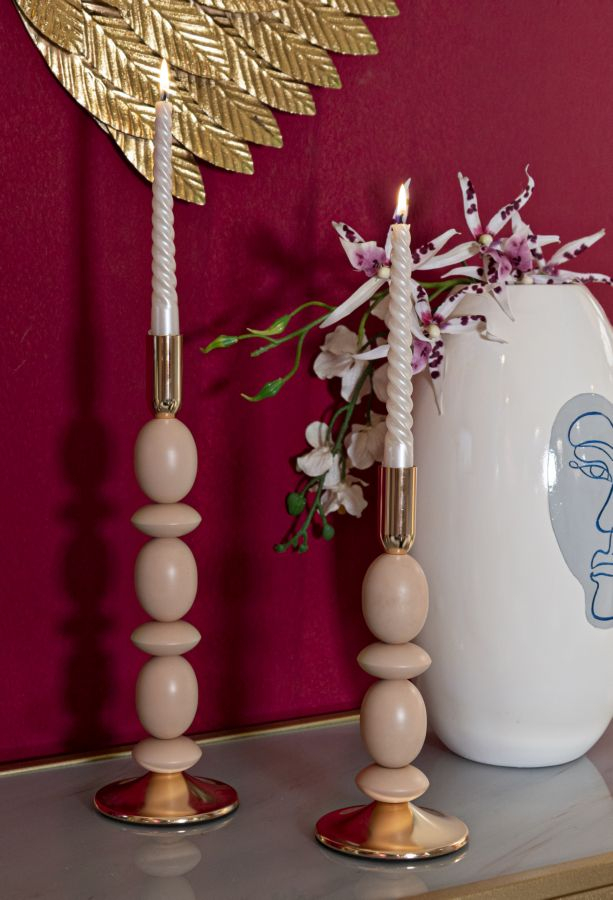 Nuanța de roz pudră, asociată cu accentele aurii, creează un efect vizual deosebit și aduce o notă de feminitate și delicatețe decorului interior. Aceste sfeșnice sunt potrivite atât pentru mesele de sărbătoare, cât și pentru colțurile de relaxare din living sau dormitor.