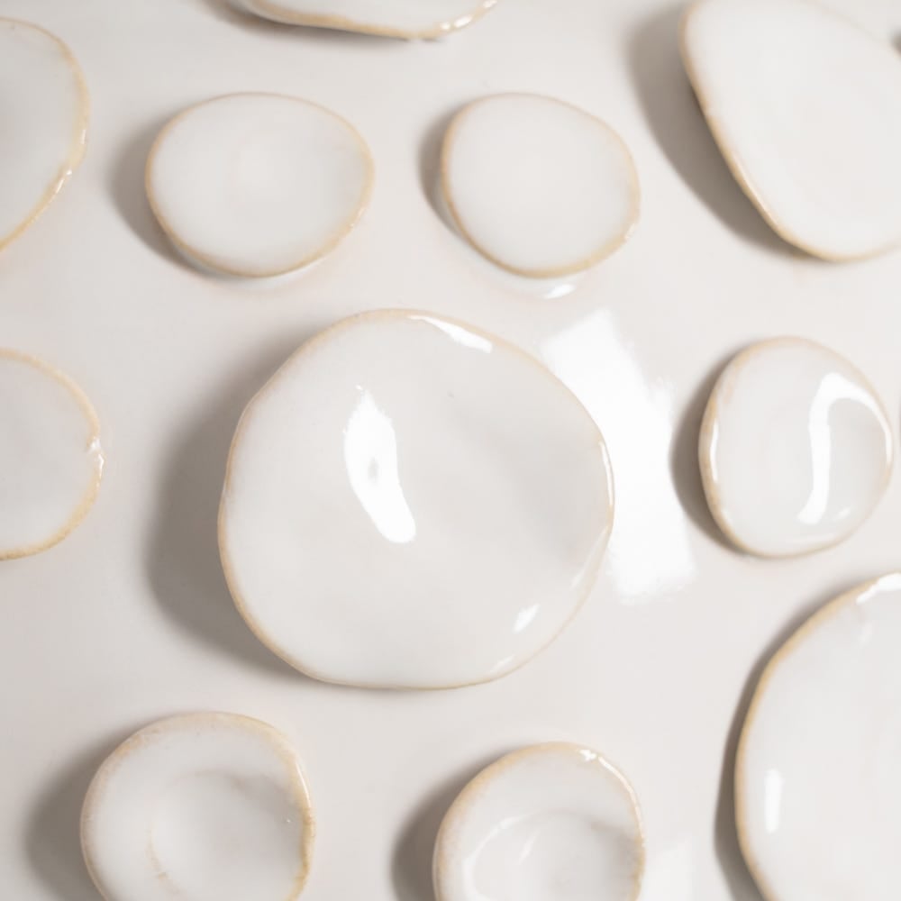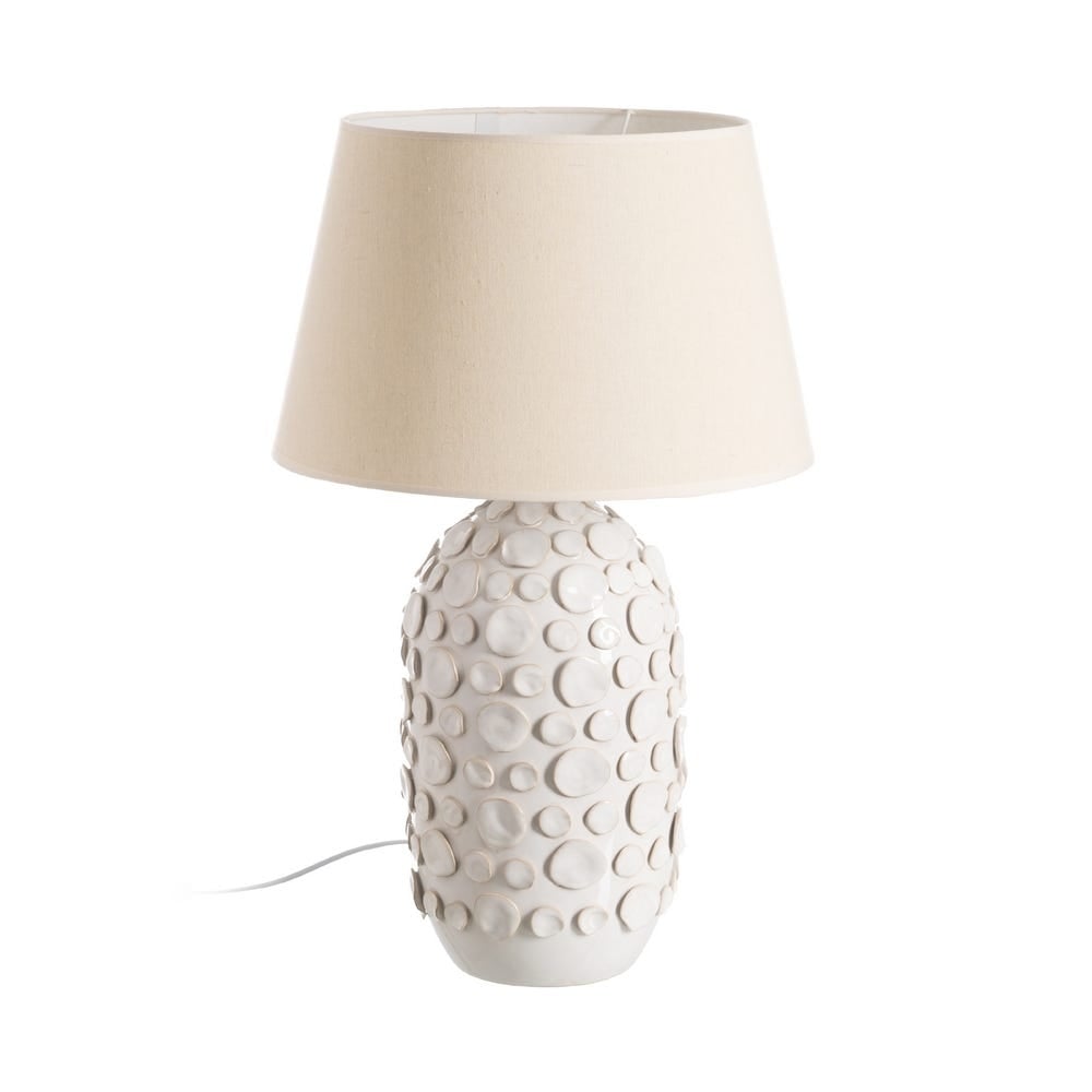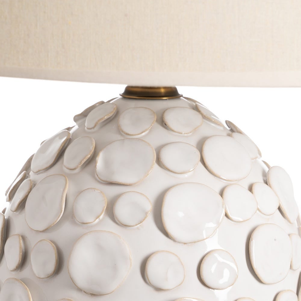 Baza cu forme organice și buline reliefate creează jocuri de lumină atractive, iar finisajul alb lucios menține un aspect curat și versatil. Abajurul conic alb filtrează lumina într-un halou cald, confortabil pentru citit sau relaxare.