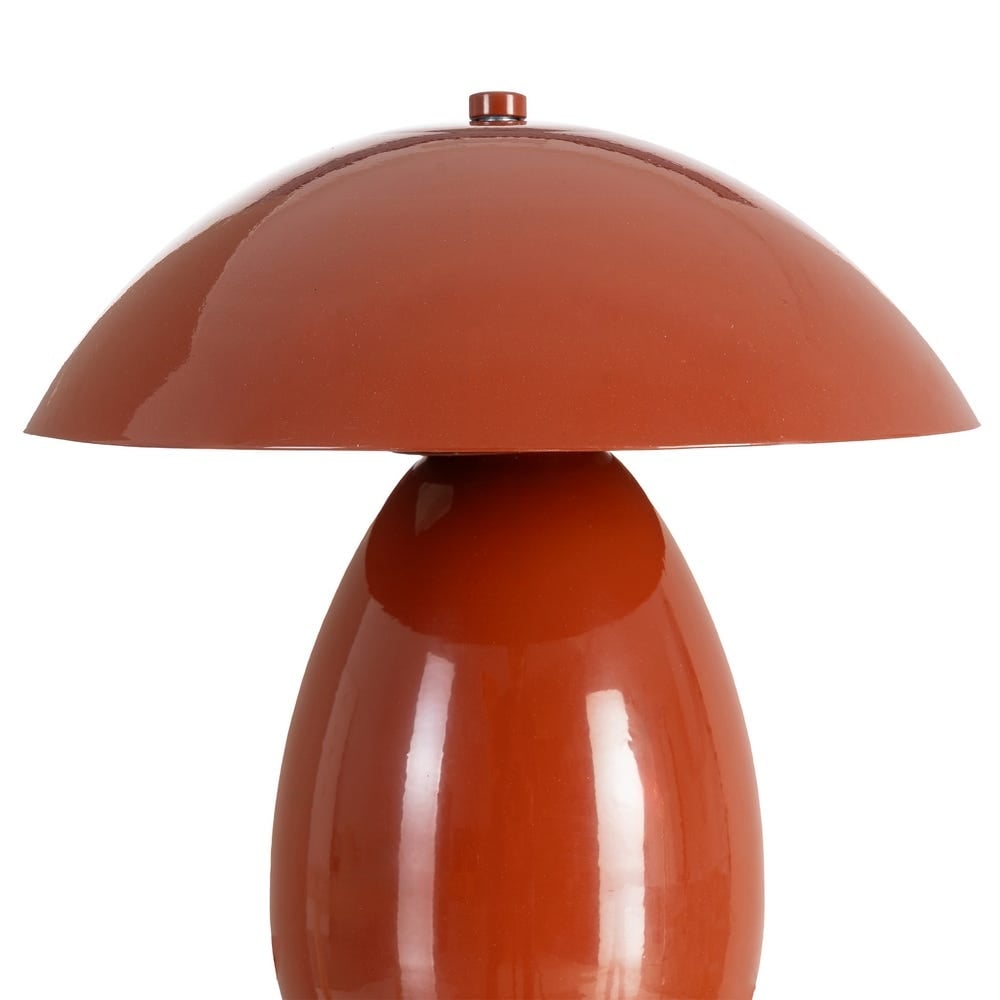 Baza ovală, cu volum plin, și abajurul amplu în formă de ciupercă oferă un joc vizual plăcut și o lumină difuză, perfectă pentru a crea o atmosferă relaxantă. Suprafața metalică lucioasă reflectă subtil lumina, adăugând profunzime și rafinament încăperii. Nuanța cărămizie caldă transformă veioza într-un accent decorativ ușor de integrat.