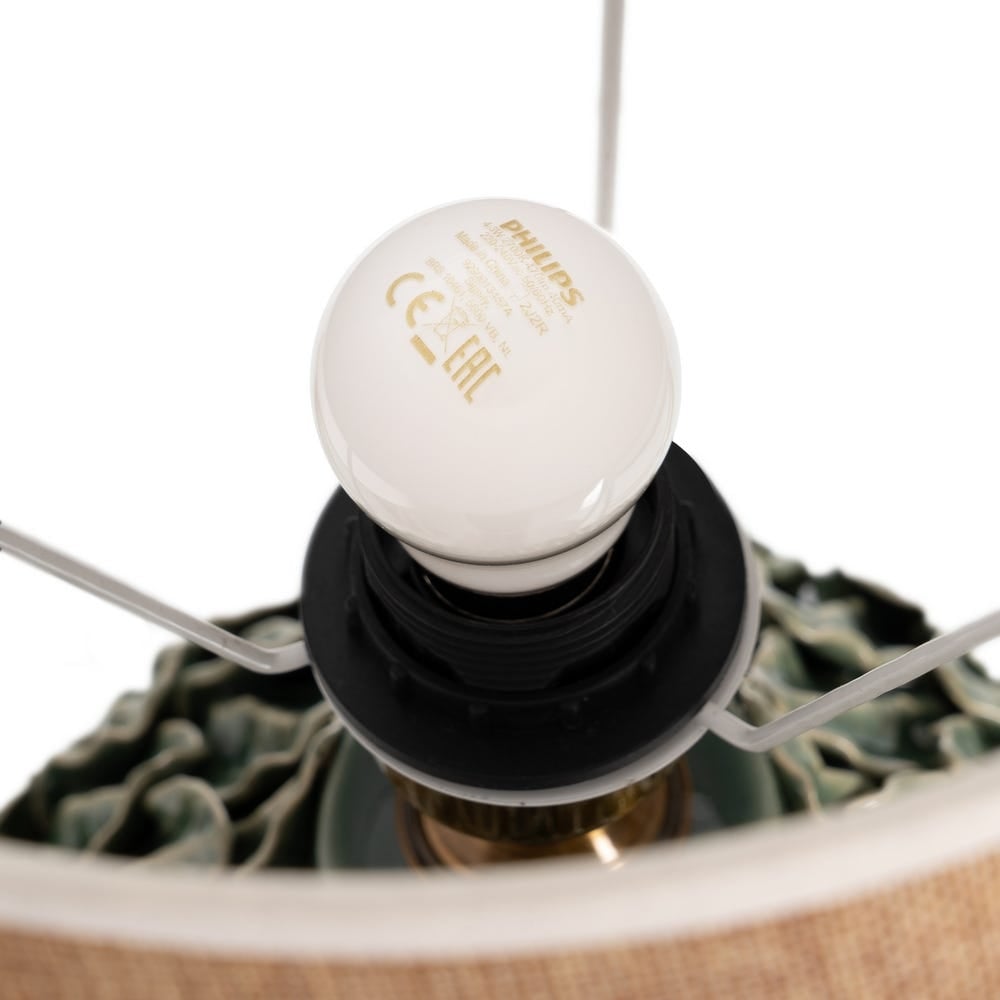 Baza sculpturală cu frunze reliefate, finisată lucios în verde, este completată de un abajur textil ce răspândește o lumină caldă și uniformă, ideală pentru noptieră, măsuță sau birou.