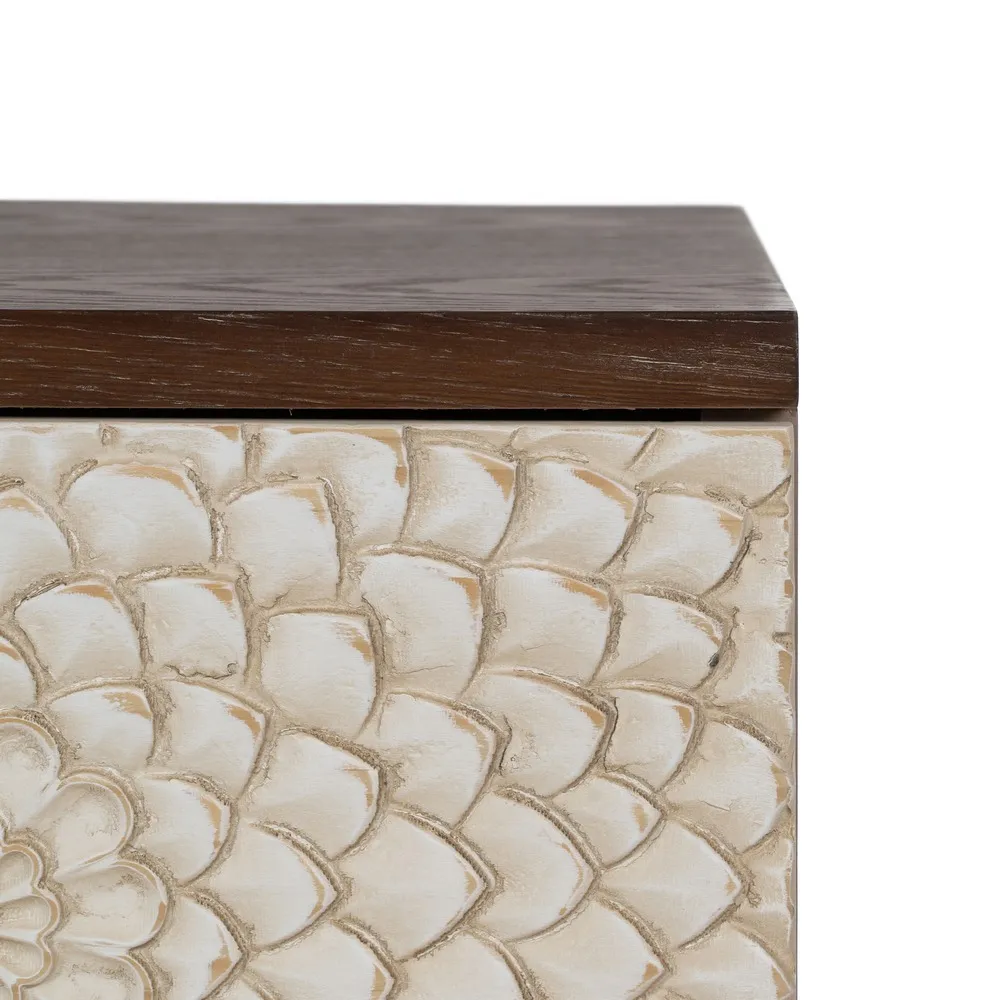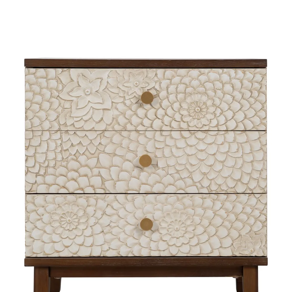 IXIA Noptiera inalta cu 3 sertare cu fata sculptata alb antic-maro Manacor 64x36x71 cm