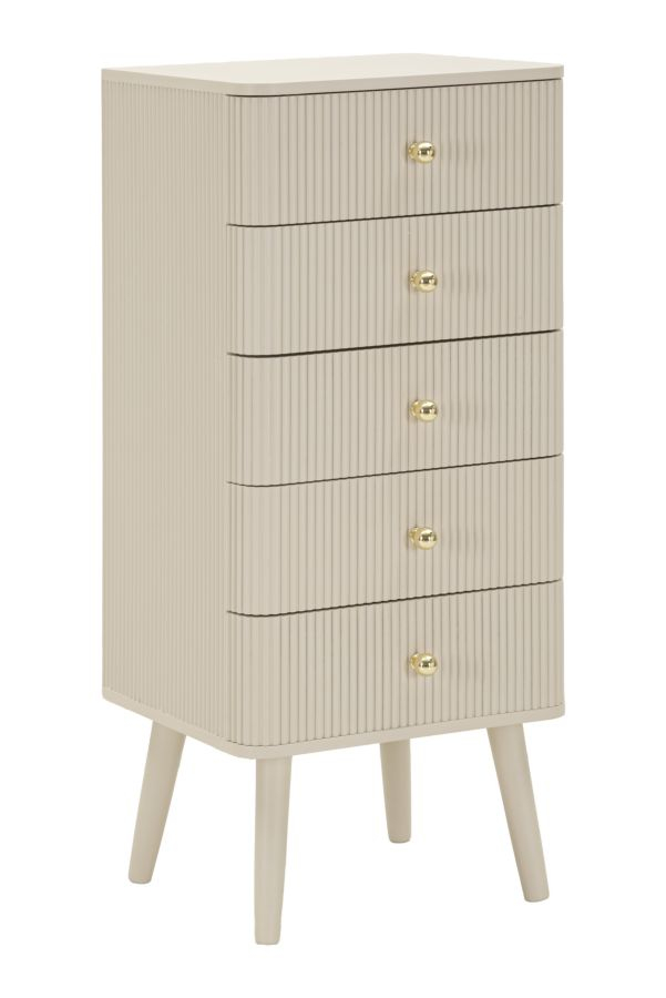 Designul vertical și proporțiile echilibrate transformă această comodă într-o piesă practică pentru organizarea obiectelor de zi cu zi. Cele cinci sertare oferă spațiu generos de depozitare, fiind ideale pentru dormitoare moderne, dressinguri sau camere unde ordinea și eleganța sunt esențiale.