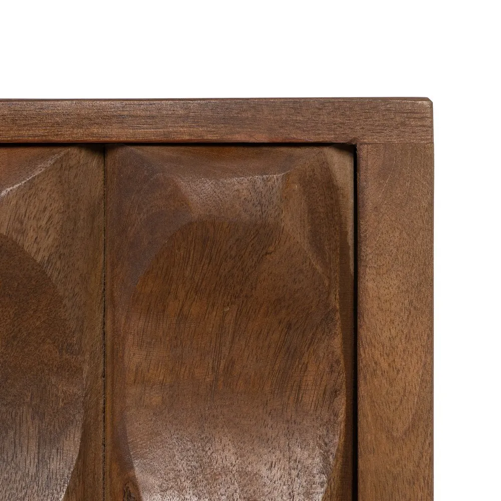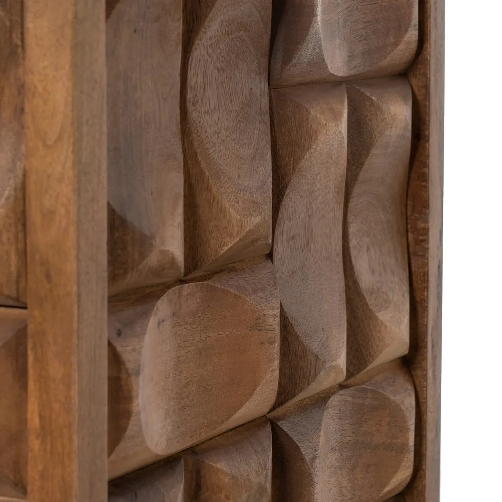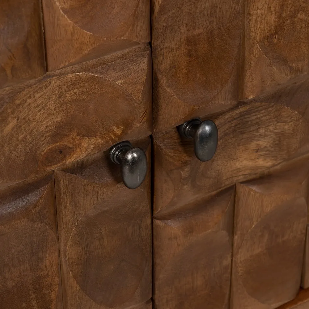 Comoda din lemn de mango maro cu finisaj unic realizat manual. Cu usile frumos sculptate, este o piesa de mobilier cu design artizanal creativ distinct, perfecta pentru a adauga un element de originalitate in livingul sau pe holul dvs. Lemnul de mango ofera un efect de raritate si naturalete, iar detaliile sculptate adauga acel efect senzational de lucru pretios executat manual. Aceasta comoda bufet, poate fi o piesa centrala iconica in decorul spatiului dvs, completand o amenajare autentica.
