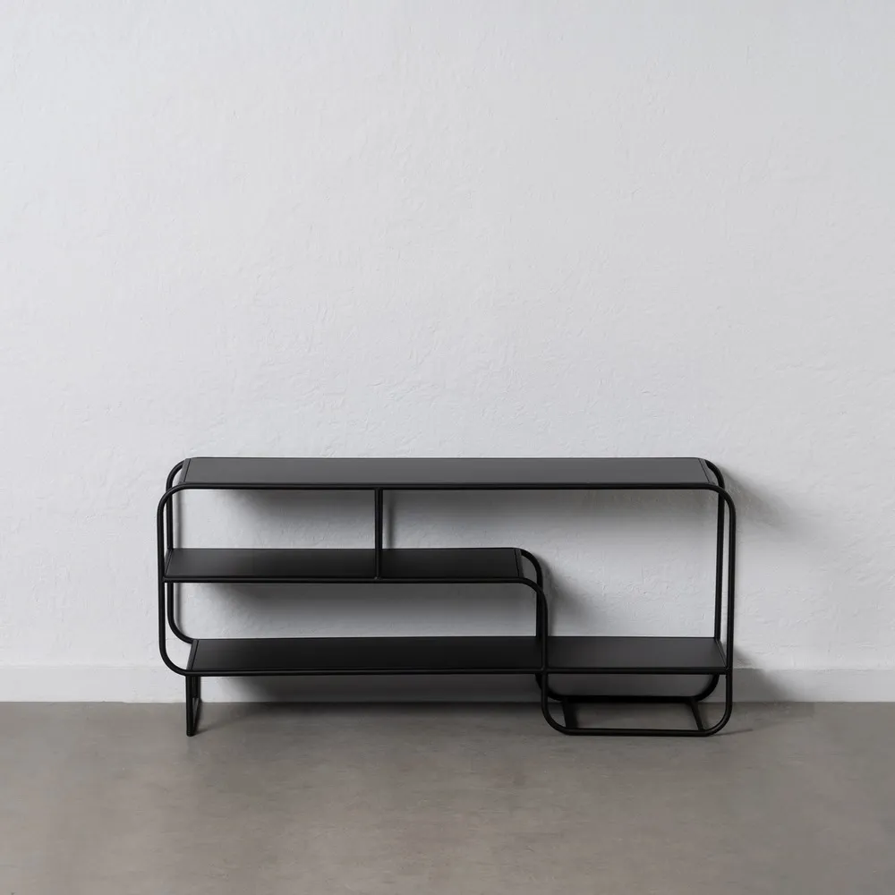 Comoda TV din metal negru cu rafturi neregulate. Practica si versatila, cu un design industrial de inspiratie nordica, se poate amplasa in orice spatiu lateral sau chiar pe holuri. Asezati deasupra o oglinda sau o decoratiune metalica de perete si veti obtine un decor complet extrem de original.