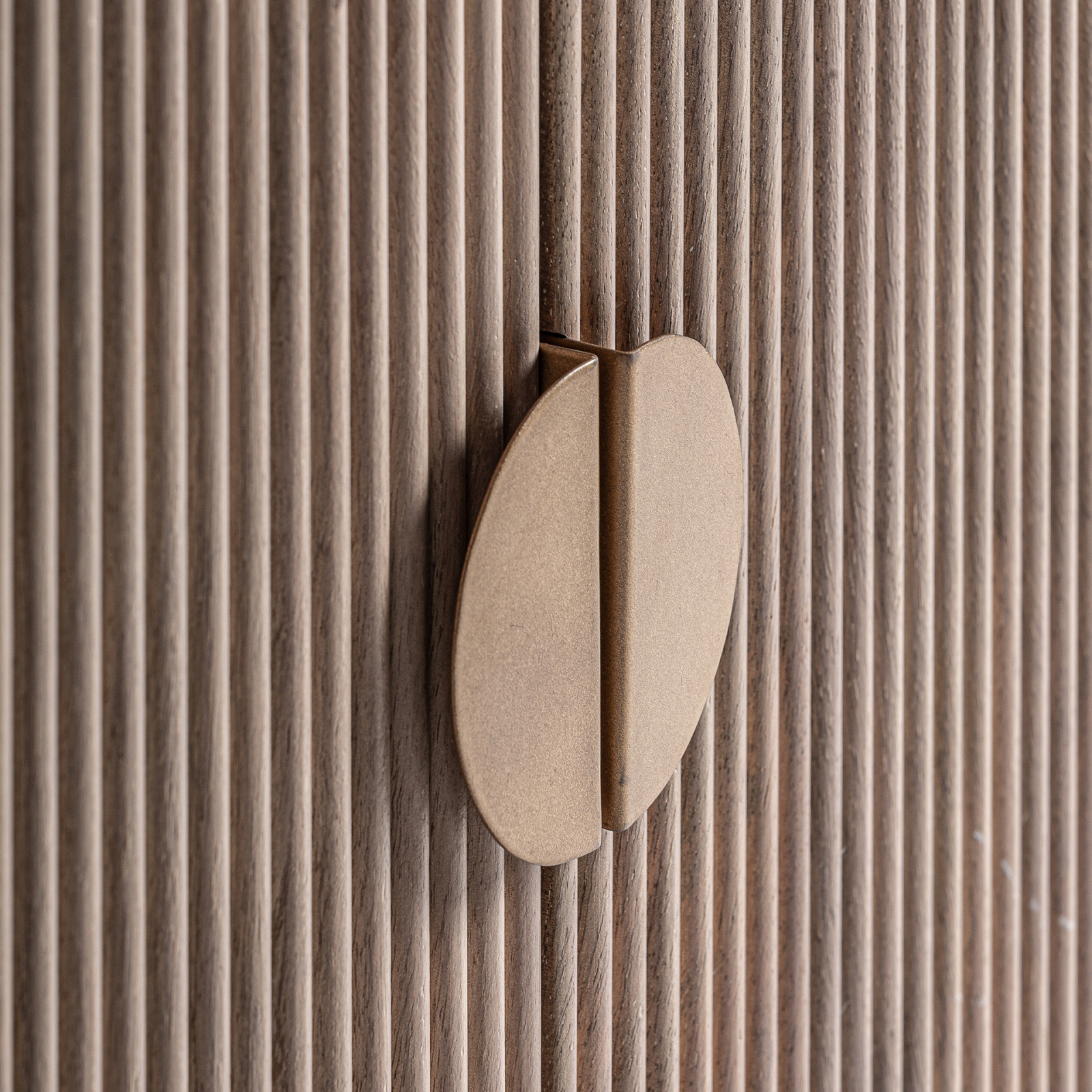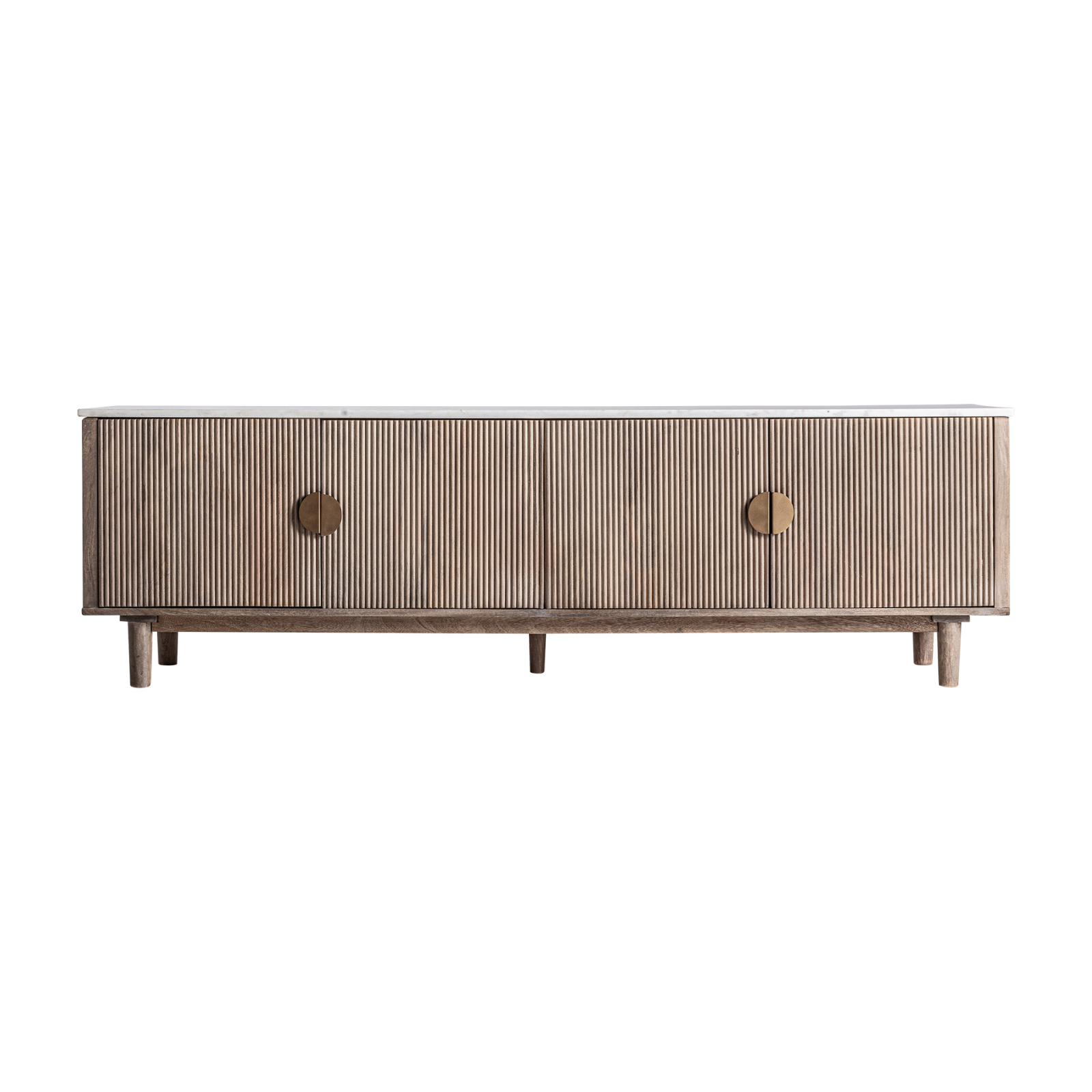 Realizată din lemn de mango în nuanțe naturale de maro, comoda este evidențiată de fronturile riflate care adaugă profunzime și ritm vizual. Blatul din marmură albă, cu vene subtile, aduce un contrast sofisticat și completează compoziția cu o notă premium, potrivită pentru amenajări contemporane sau elegante.