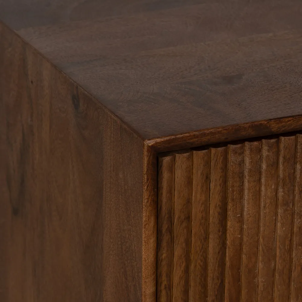 Comodă versatilă cu design minimalist și suprafață în relief. Spațiu generos de depozitare în spatele ușilor. Adaugă stil și funcționalitate în dormitor, living sau hol.
