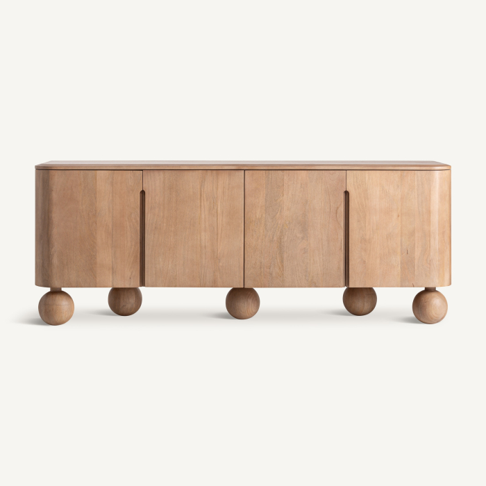Nu este doar o piesă de depozitare, ci un element care atrage privirea prin detaliile sale neobișnuite și proporțiile bine echilibrate. Picioarele sferice adaugă un accent sculptural discret, iar suprafața din lemn de mango în tonuri deschise contribuie la o atmosferă caldă și relaxată.