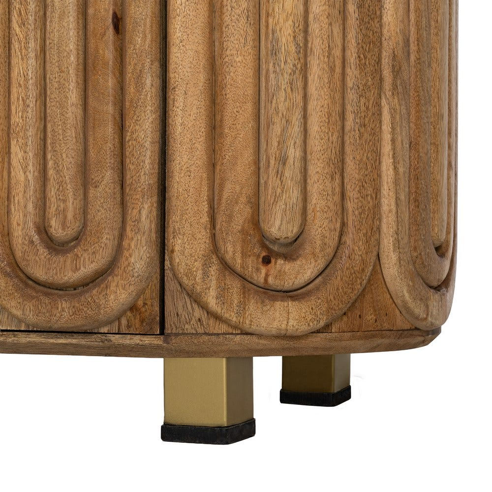 Acest bufet din lemn de mango se remarcă printr-un design decorativ elegant, inspirat din limbajul Art Deco reinterpretat într-o cheie contemporană. Fronturile canelate cu forme arcuite creează un ritm vizual sofisticat, aducând profunzime și personalitate piesei, în timp ce proporțiile echilibrate îi conferă o prezență solidă, dar rafinată.