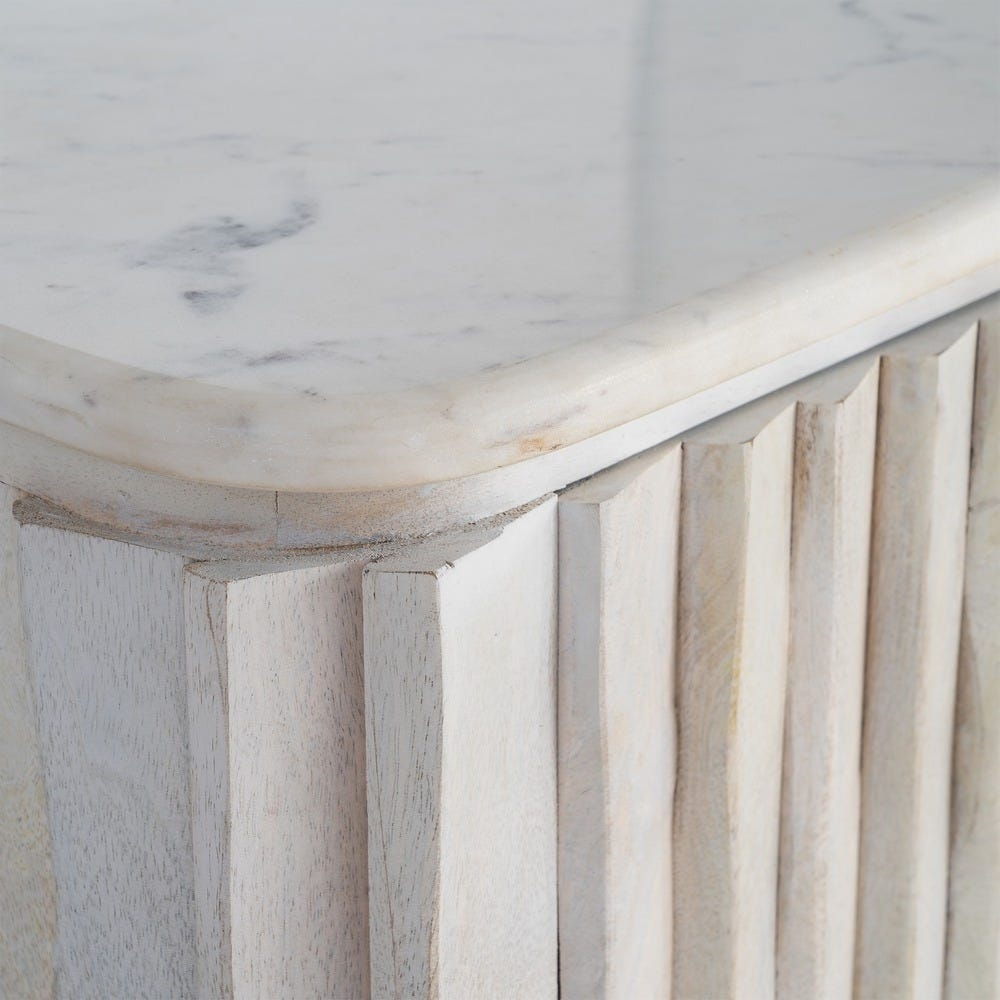 Acest bufet se remarcă printr-un design organic și expresiv, definit de fronturile cu textură verticală ondulată, realizate manual. Lemnul de mango, finisat într-o nuanță deschisă și luminoasă, evidențiază imperfecțiunile naturale și variațiile de fibră, oferind piesei un caracter autentic și cald. Blatul din marmură completează armonios ansamblul, adăugând un accent rafinat și o notă subtilă de eleganță.