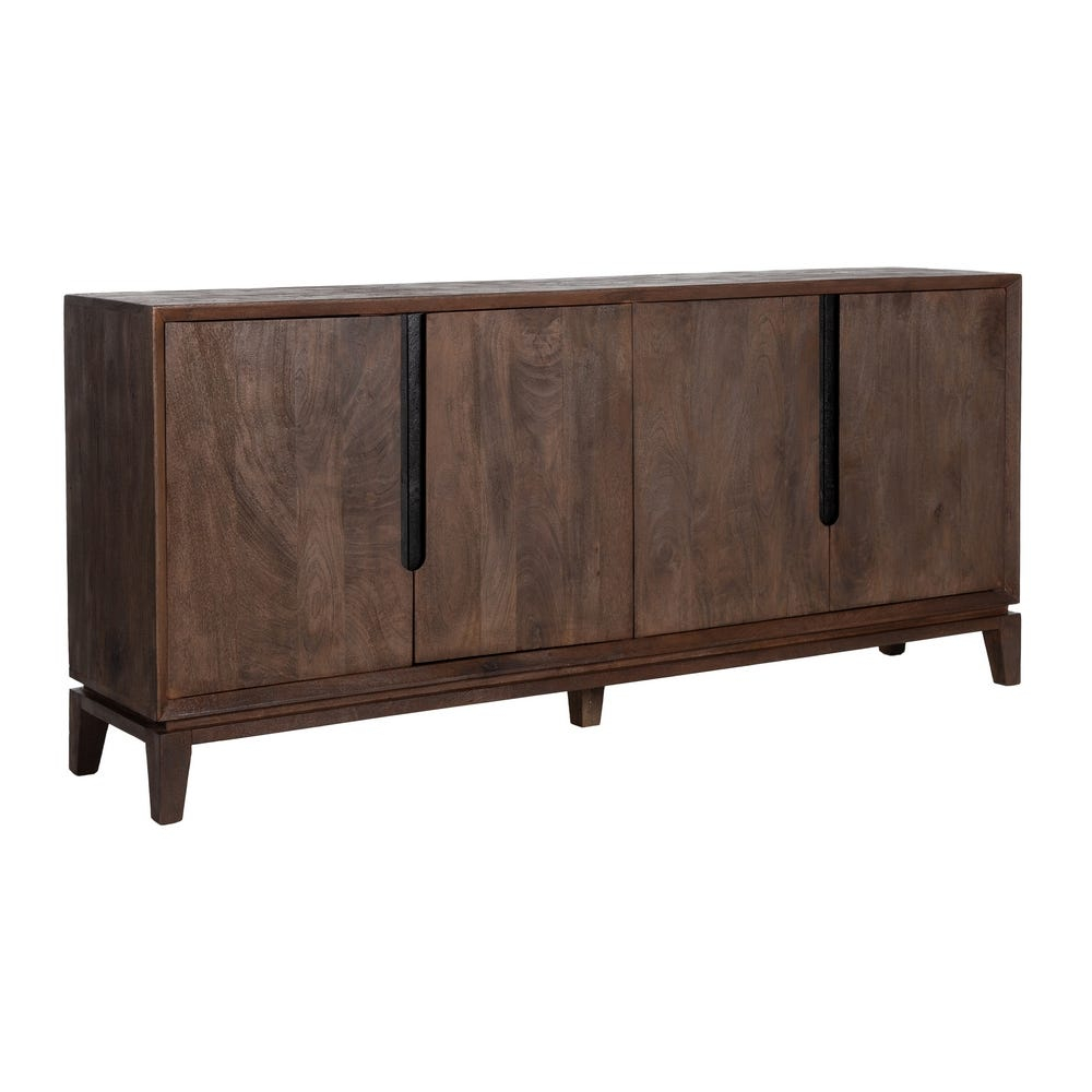 Liniile plane și proporțiile joase dau piesei o atitudine modernă, iar nuanța maro închis pune în evidență fibra lemnului. Mânerele verticale decupate creează un accent grafic discret, în timp ce picioarele ușor evazate ridică volumul și conferă lejeritate vizuală.