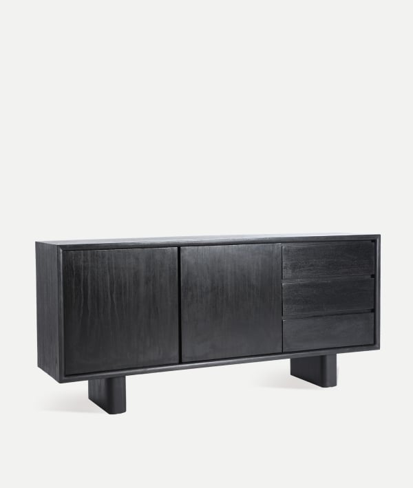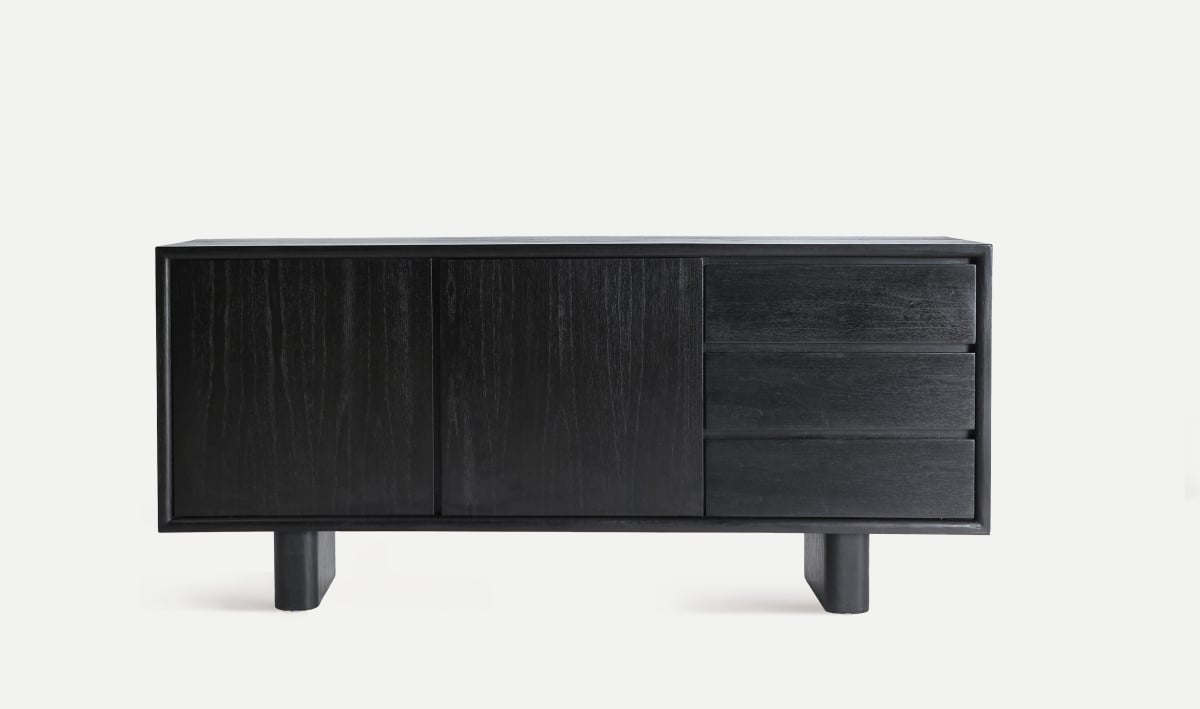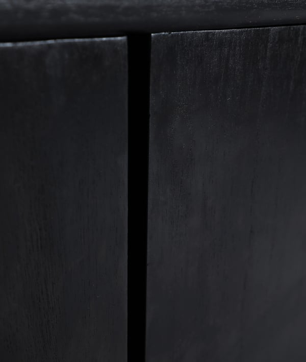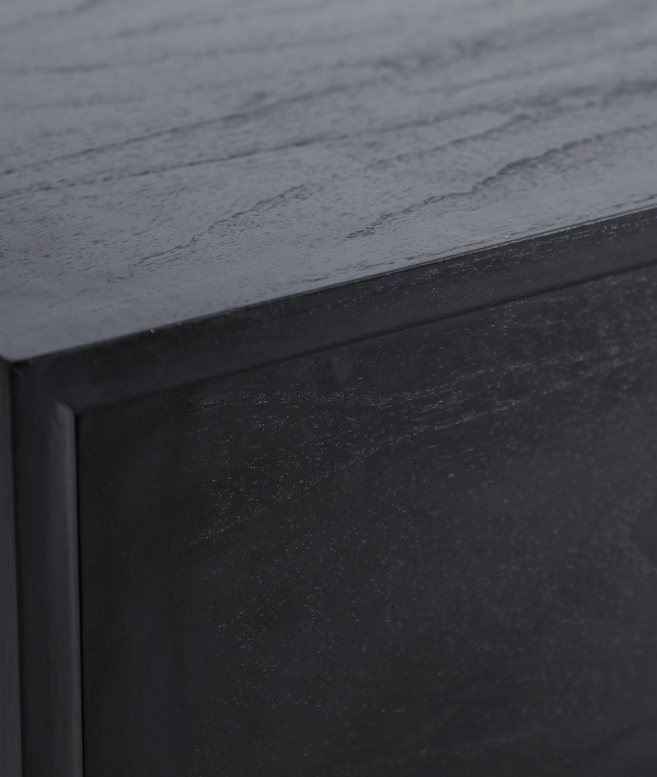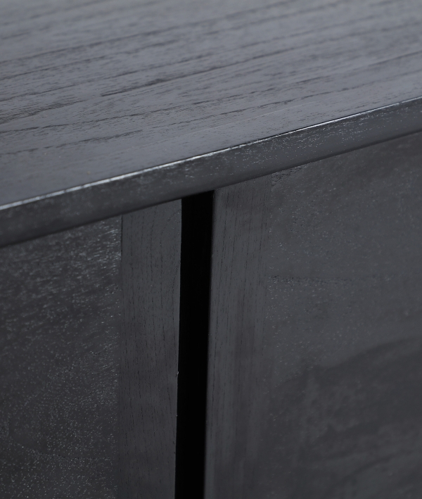 DEMMIN se remarcă prin proporțiile sale echilibrate și finisajul mat negru, care accentuează textura naturală a lemnului de mindi. Designul minimalist, cu fronturi netede și linii drepte, creează o senzație de ordine și calm, ideală pentru livinguri, dininguri sau birouri sofisticate.