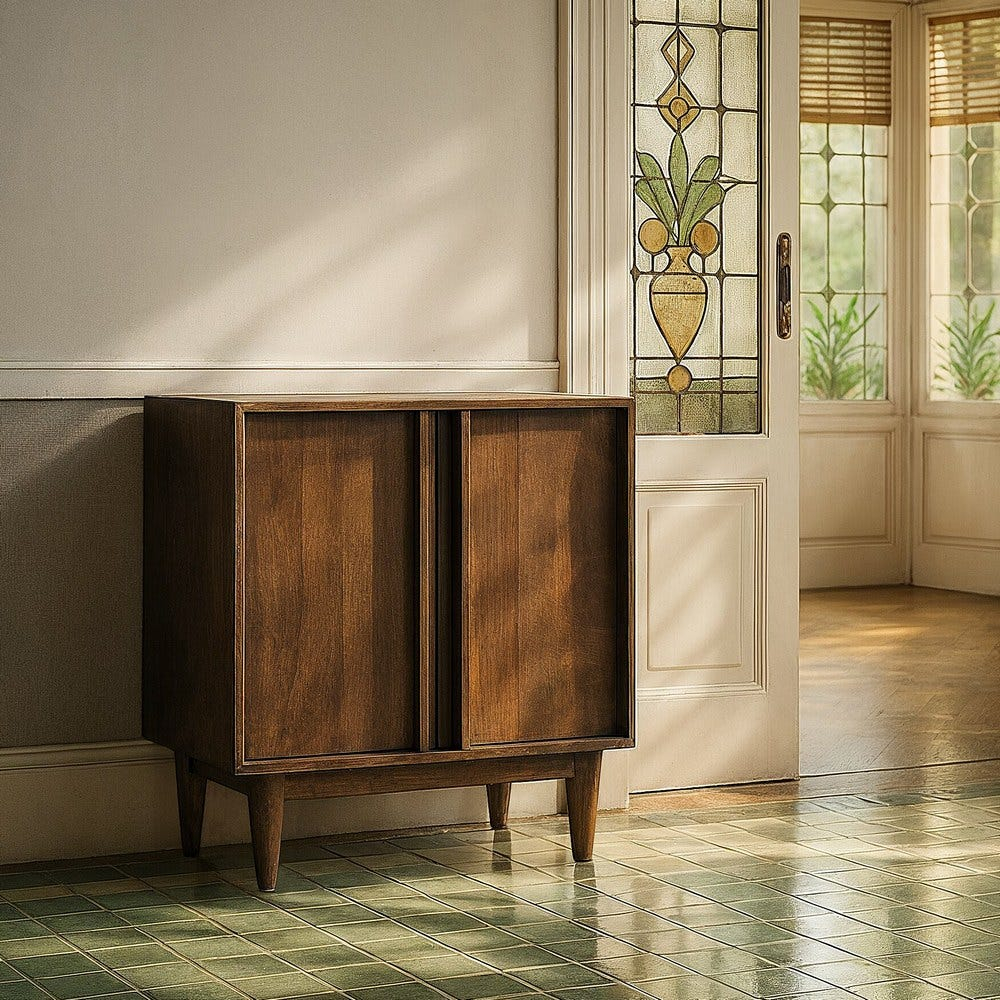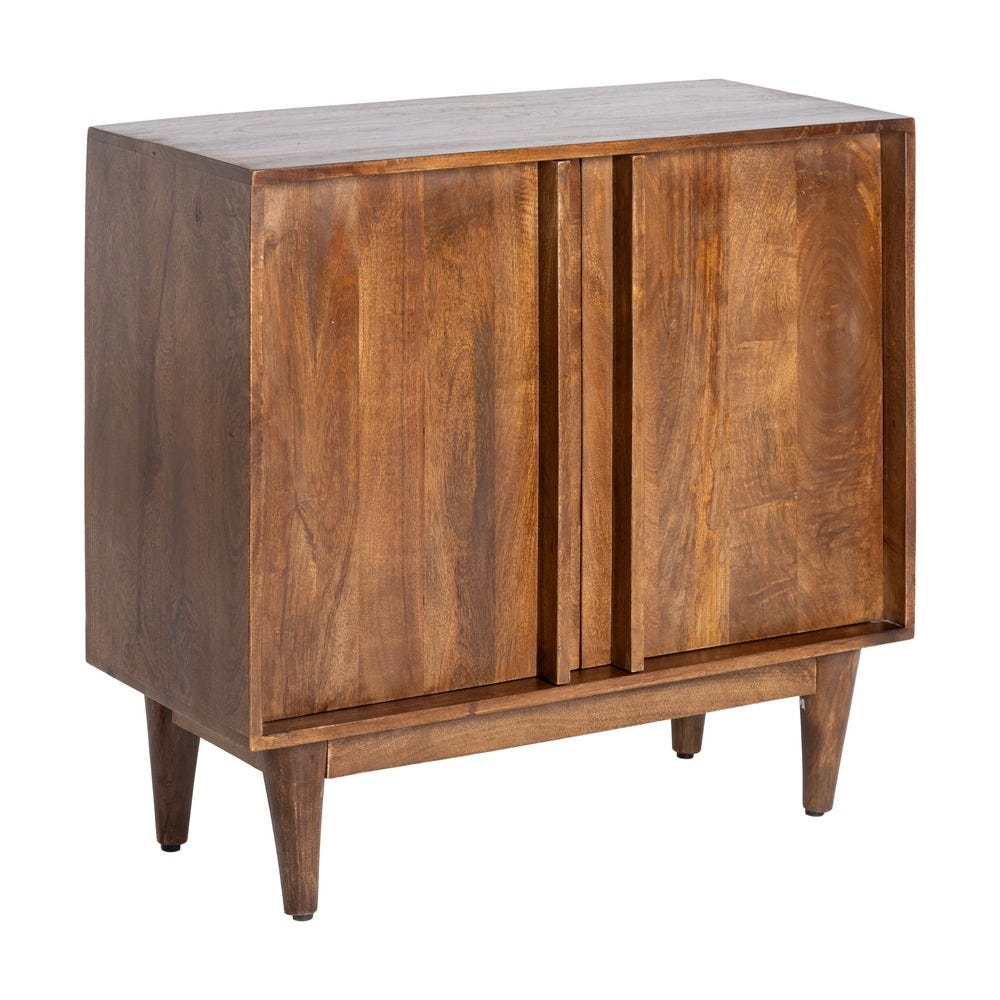 Comodă din lemn de mango maro cu două uși pentru hol, living sau dining, care aduce textură caldă a lemnului și, în același timp, un profil modern cu picioare conice și mânere verticale discrete.