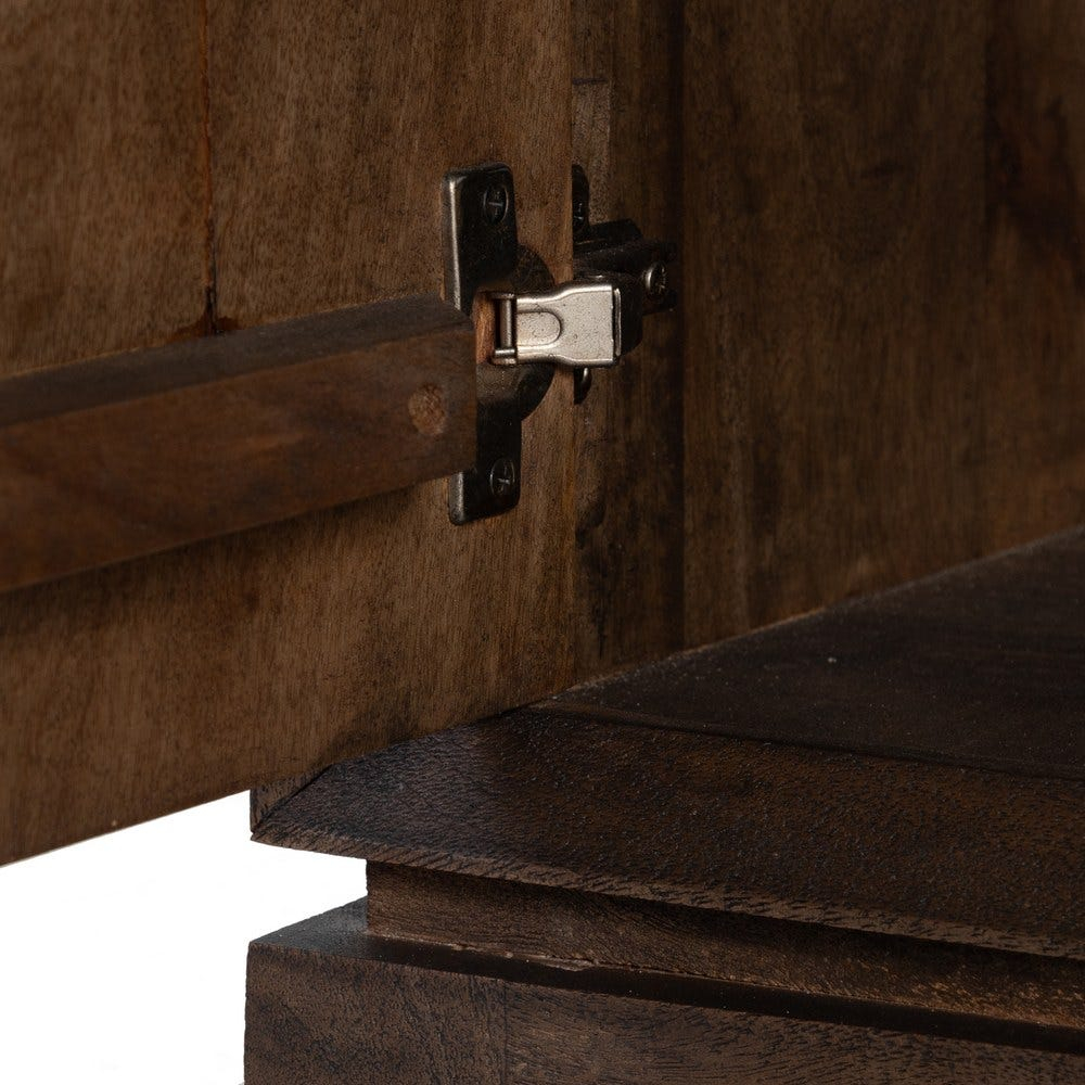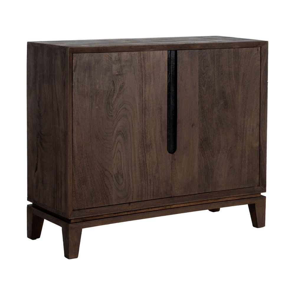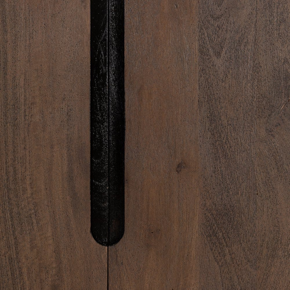 Comodă din lemn de mango maro Kilian pentru hol, living sau dining, care îmbină volumetria compactă cu depozitare practică și care pune în valoare textura naturală prin fronturi plane și prin detaliul vertical de prindere.