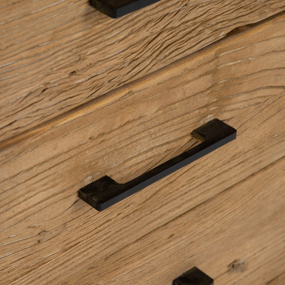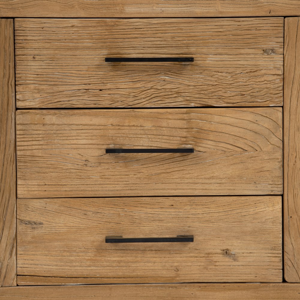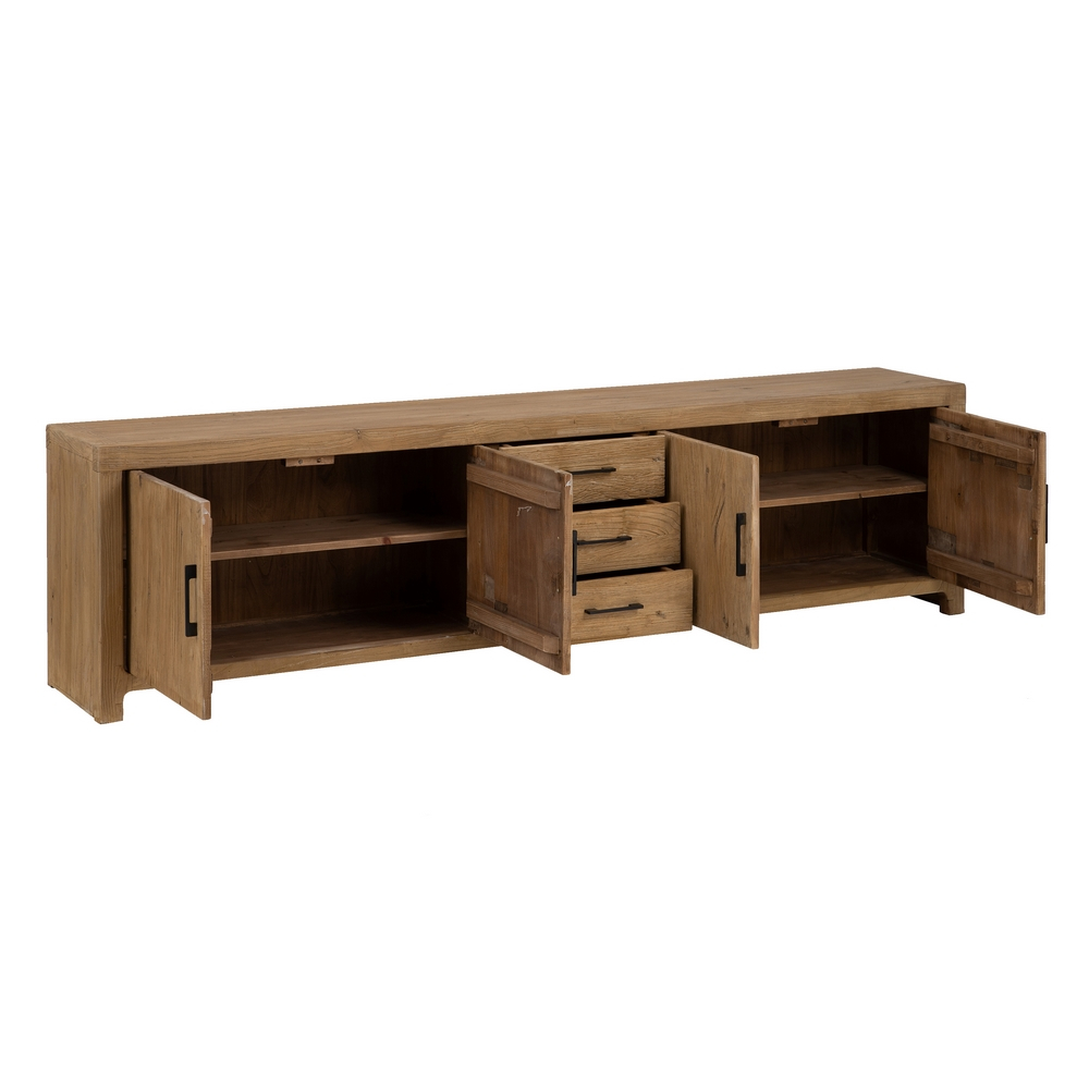 Comodă impunătoare din lemn de ulm, cu dimensiuni generoase de 254 cm lungime, 40 cm lățime și 66 cm înălțime, ideală pentru amenajarea unui living sau a unui hol spațios. Cele patru uși (48x49 cm) oferă acces la compartimente de depozitare încăpătoare, perfecte pentru organizarea discretă a diverselor obiecte. În plus, cele trei sertare (48,5x16,5 cm) asigură un spațiu suplimentar pentru accesoriile de zi cu zi. Picioarele de 6,5 cm adaugă stabilitate și un design elegant, completând aspectul modern al acestei piese. Comode din lemn de ulm de calitate superioară disponibile doar la CreativDeco.