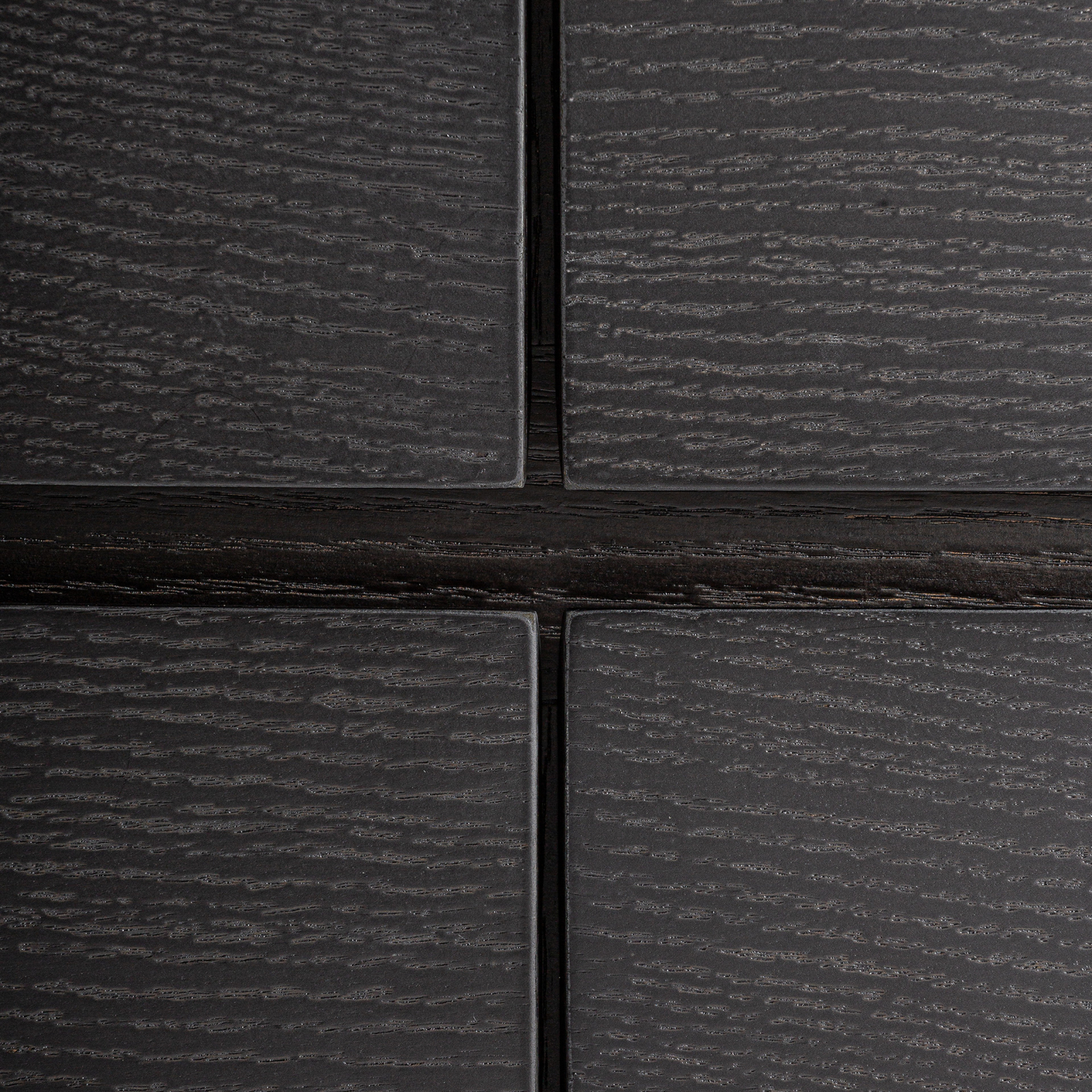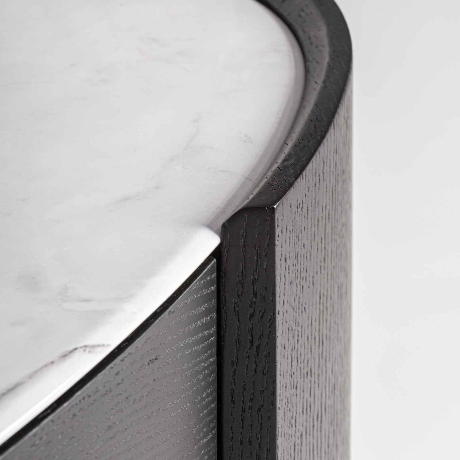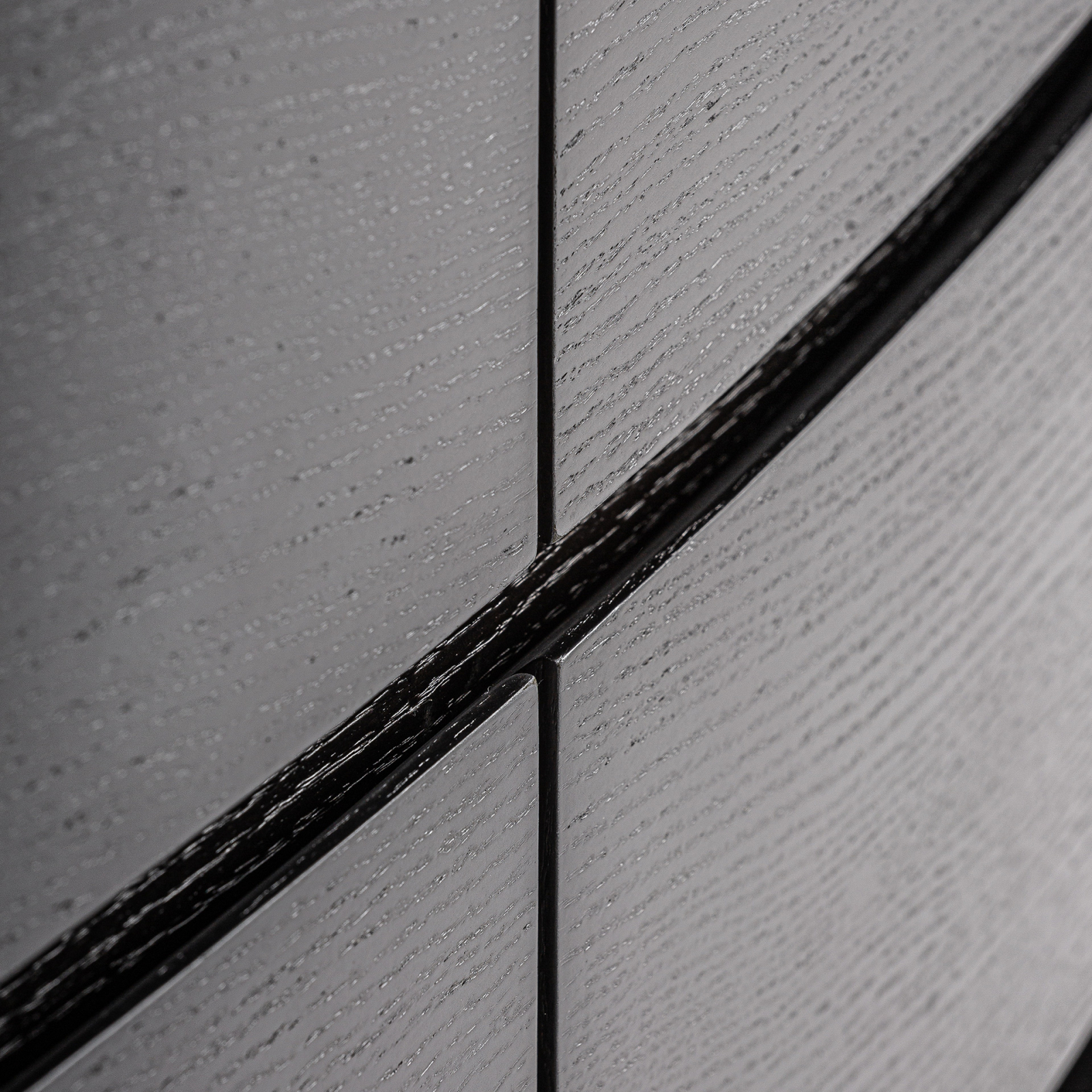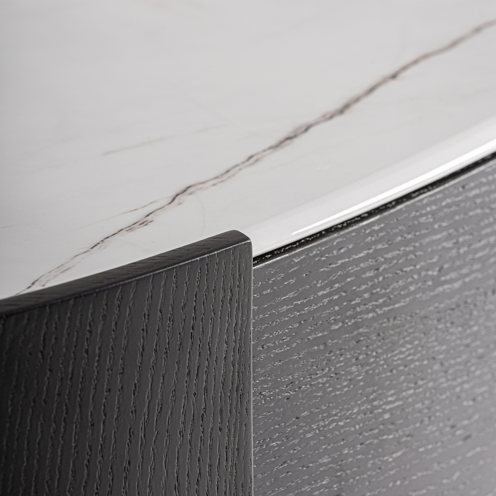 Realizată din lemn contrachapat cu furnir de stejar în nuanță neagră, piesa evidențiază textura naturală a materialului și liniile rotunjite care îndulcesc vizual volumul. Blatul din piatră sinterizată adaugă un strat suplimentar de rafinament și rezistență, oferind o suprafață durabilă și ușor de integrat în amenajări contemporane.