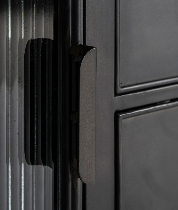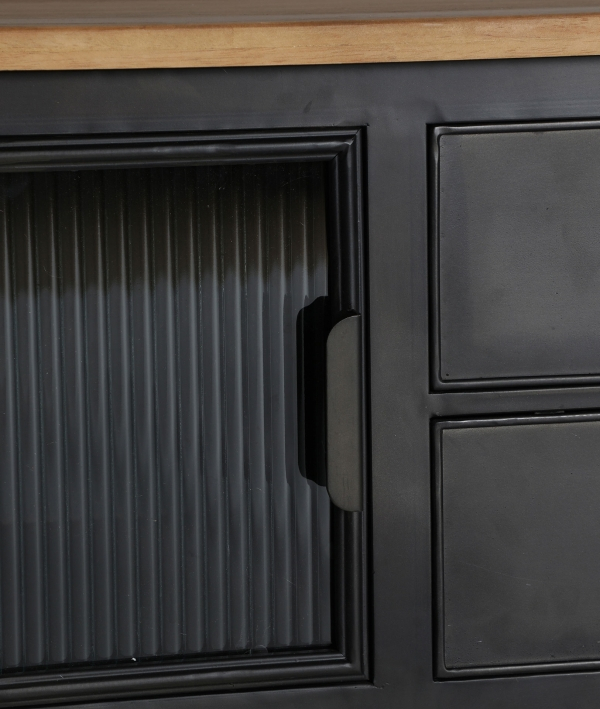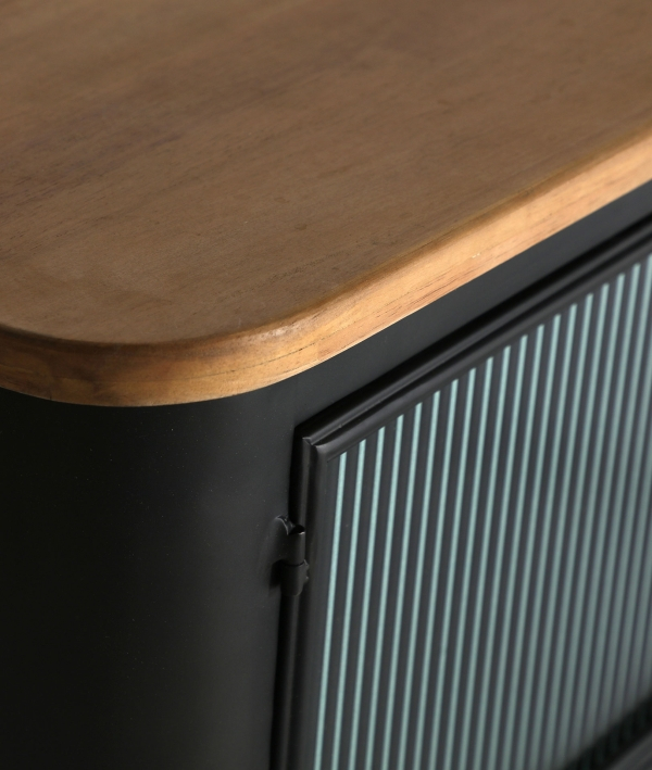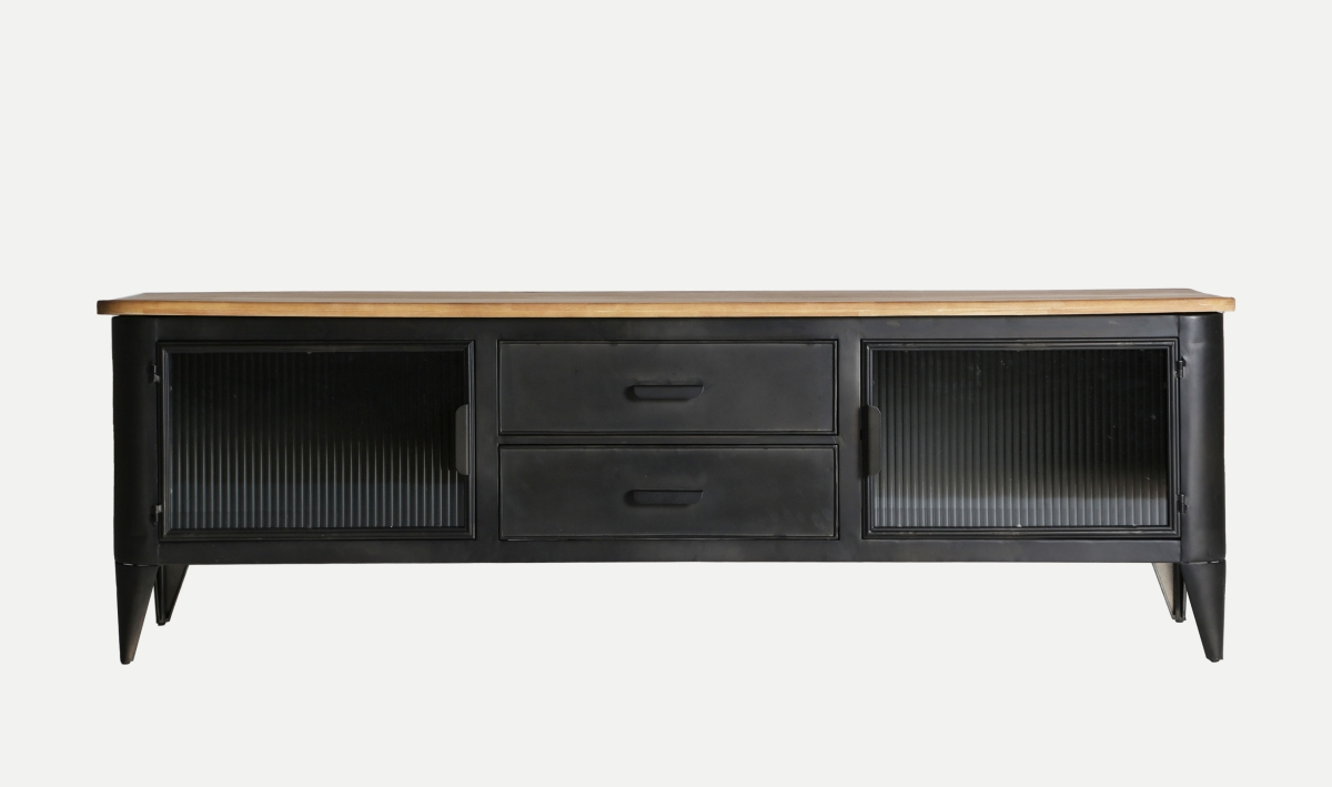 Comoda TV EASBY îmbină stilul industrial elegant cu funcționalitatea practică. Realizată din fier negru rezistent, cu uși din sticlă translucidă și un blat din lemn de cauciuc maro, această piesă de mobilier adaugă personalitate și rafinament oricărui living modern.
