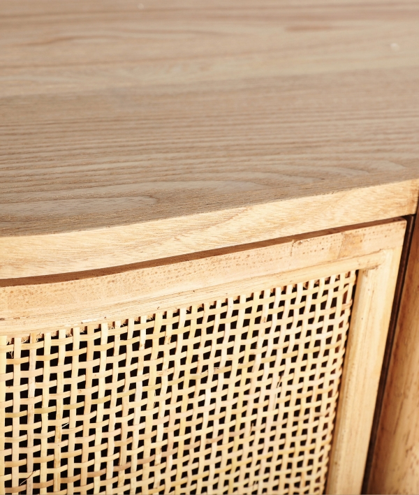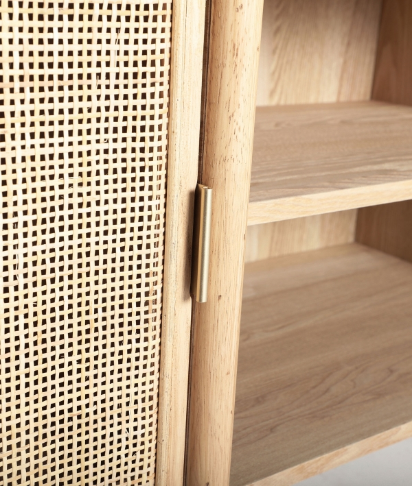 IKLA impresionează prin forma sa ovală și prin ușile arcuite cu panouri din ratan, care adaugă textură și un aer artizanal piesei. Combinația dintre MDF maro, lemnul de frasin și ratan conferă dulapului o notă caldă, naturală și autentică. Raftul central oferă spațiu practic pentru dispozitive și accesorii media, în timp ce compartimentele laterale permit organizarea discretă a obiectelor.