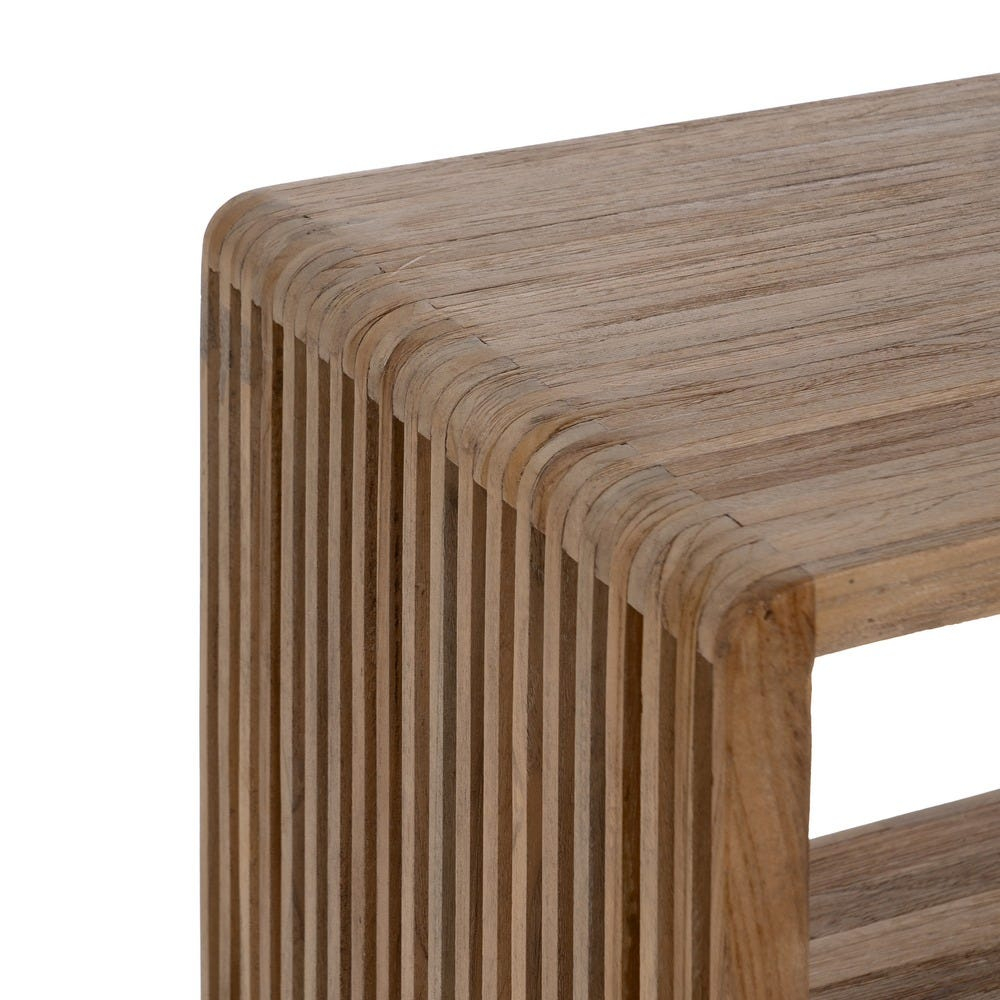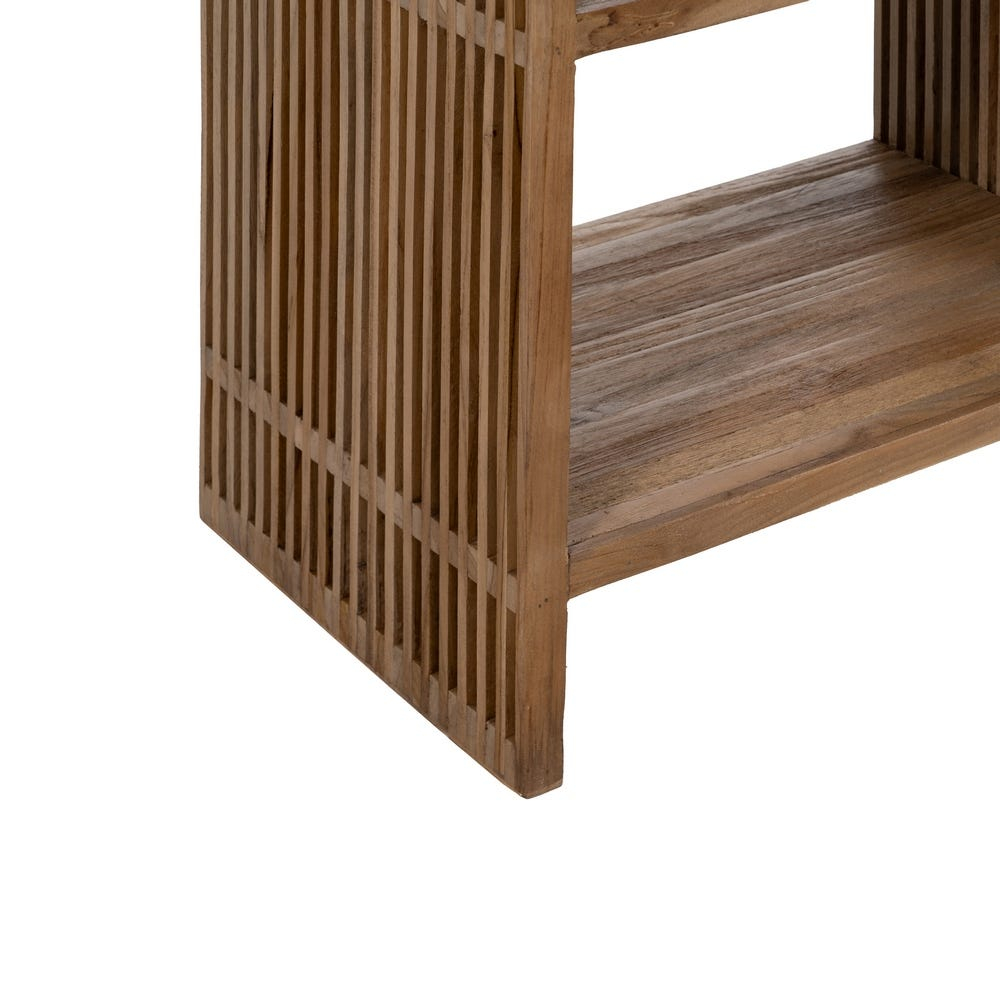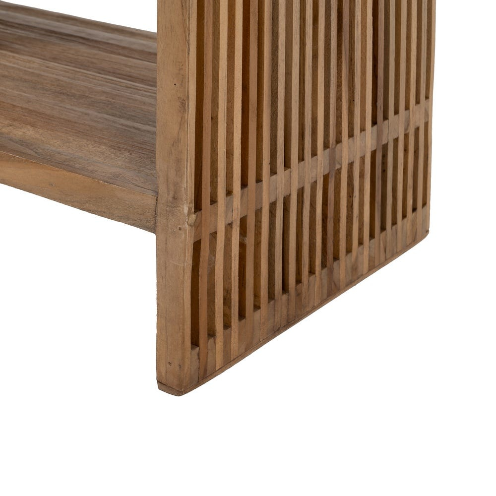 Silhueta verticală, cu margini rotunjite și ritm de șipci pe laterale, creează o prezență elegantă și aerisită. Finisajul natural al tecului evidențiază fibra lemnului, aducând căldură vizuală și un accent organic. Polițele proporționate practic oferă loc pentru cărți, ceramică, cutii decorative și plante mici.